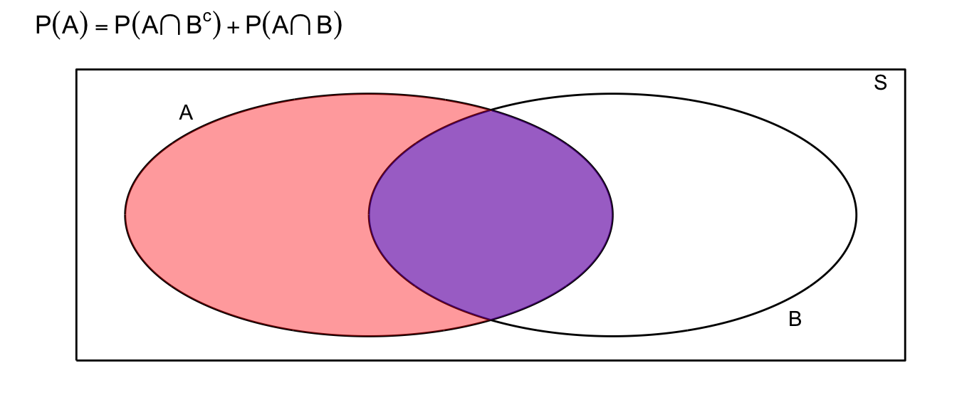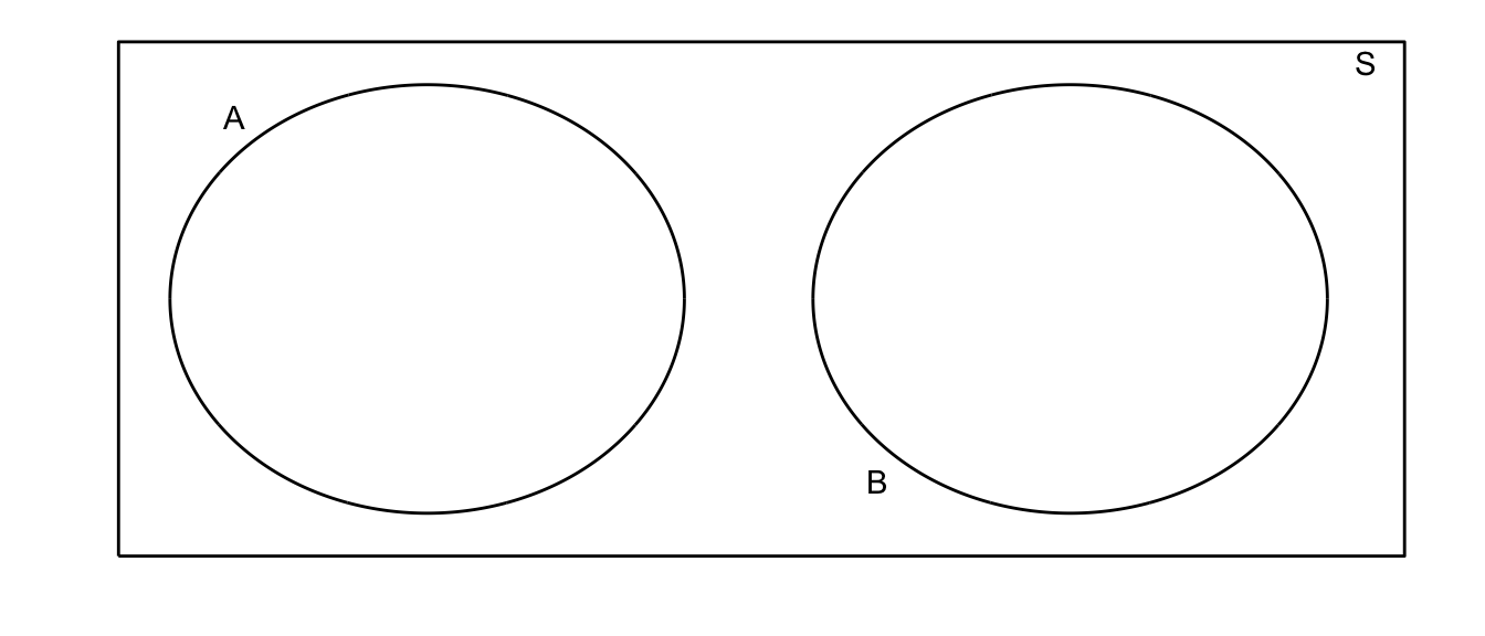 Because \(S\) is the set of all events that might occur, the area of our bounding rectangle will be \(1\) and the probability of event \(A\) occurring will be represented by the area in the circle \(A\).