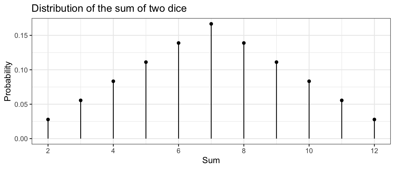 Example: Consider the discrete random variable \(S\), the sum of two fair dice.