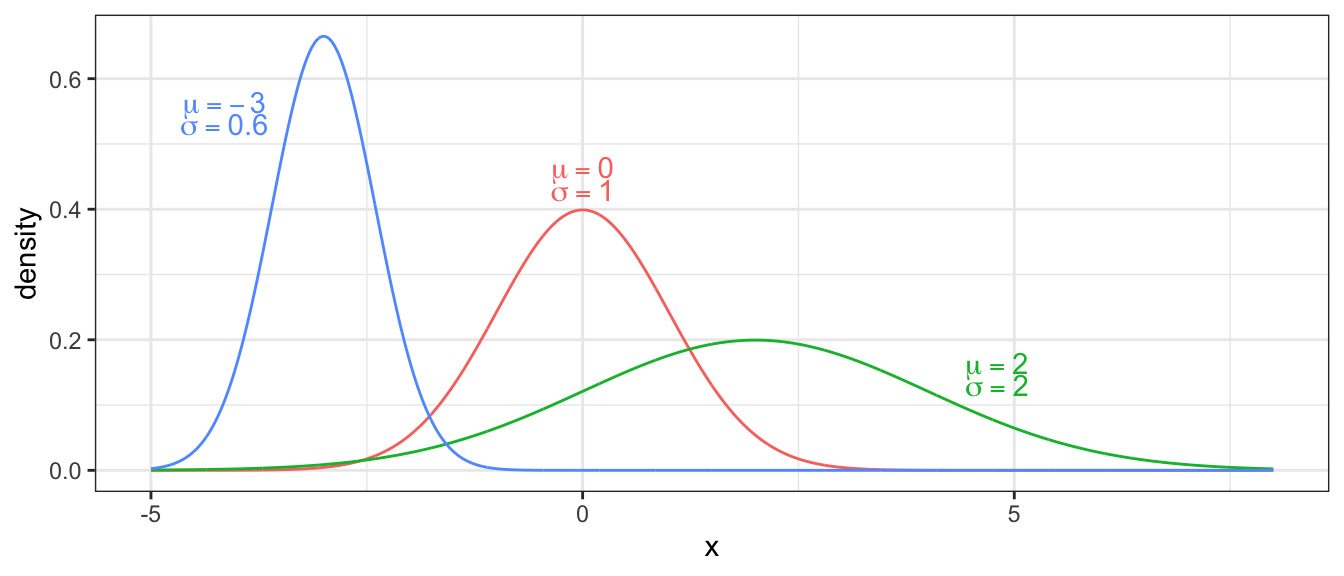 Undoubtedly the most important distribution in statistics is the normal distribution. If my RV \(X\) is normally distributed with mean \(\mu\) and standard deviation \(\sigma\), its probability density function is given by \[f(x)=\frac{1}{\sqrt{2\pi}\sigma}\exp\left[-\frac{(x-\mu)^{2}}{2\sigma^{2}}\right]\] where \(\exp[y]\) is the exponential function \(e^{y}\). We could slightly rearrange the function to