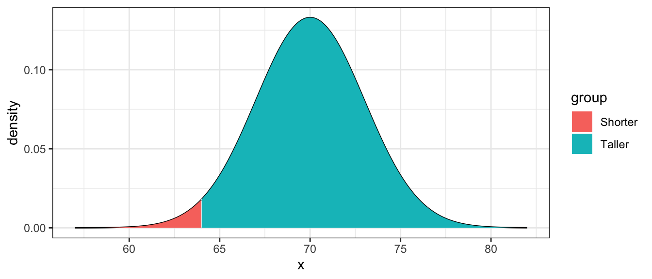 Example: It is known that the heights of adult males in the US is approximately normal with a mean of 5 feet 10 inches (\(\mu=70\) inches) and a standard deviation of \(\sigma=3\) inches. One of the textbook authors is a mere 5 feet 4 inches (64 inches). What proportion of the population is shorter than the author?