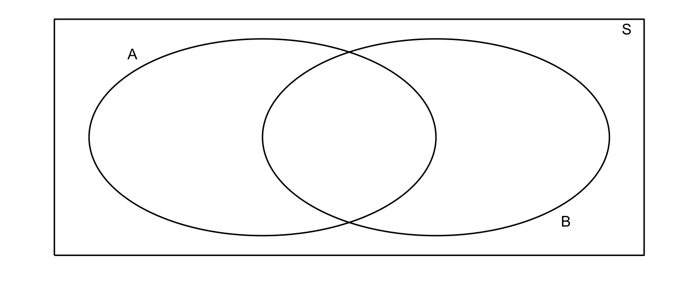 Let \(S\) be the set of all outcomes of my random trial. Suppose I am interested in two events \(A\) and \(B\). The traditional way of representing these events is using a Venn diagram.