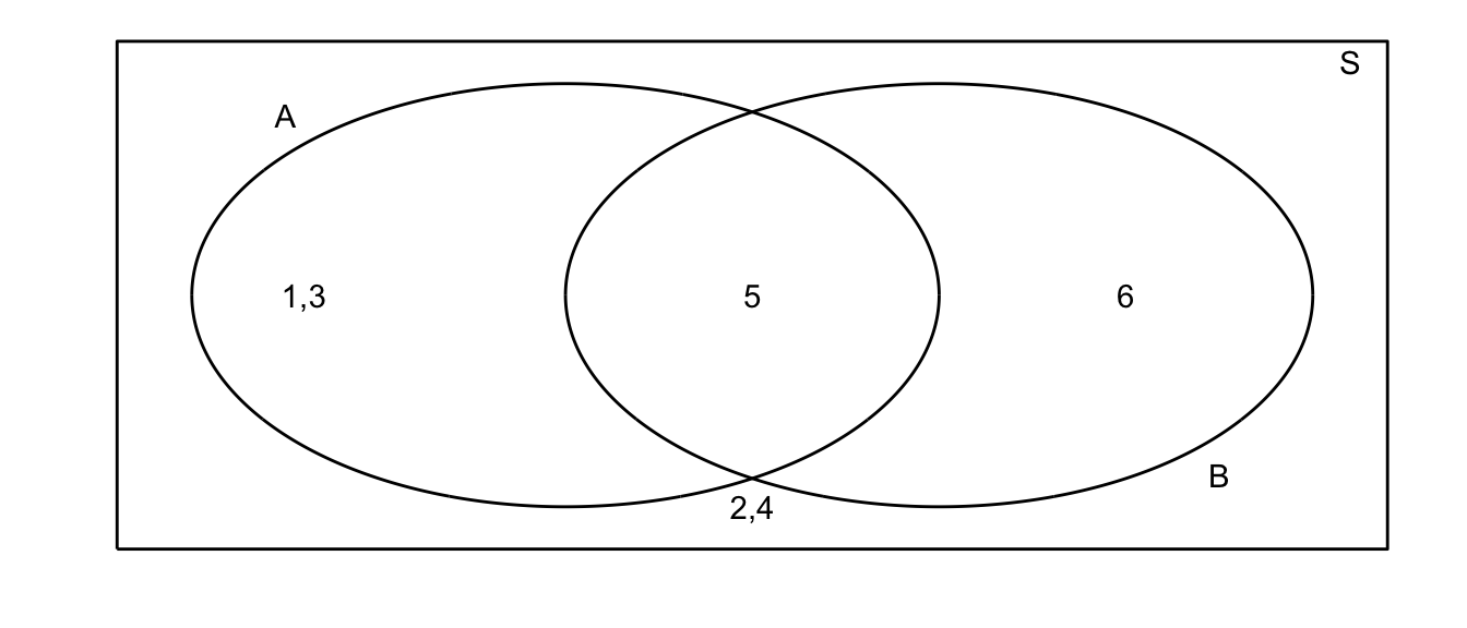 For example, suppose that my random experiment is rolling a fair 6-sided die once. The possible outcomes are \(S=\{1,2,3,4,5,6\}\). Suppose I then define events \(A=\) roll is odd and \(B=\) roll is 5 or greater. In this case our picture is: