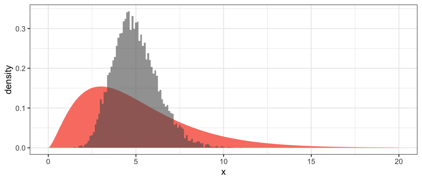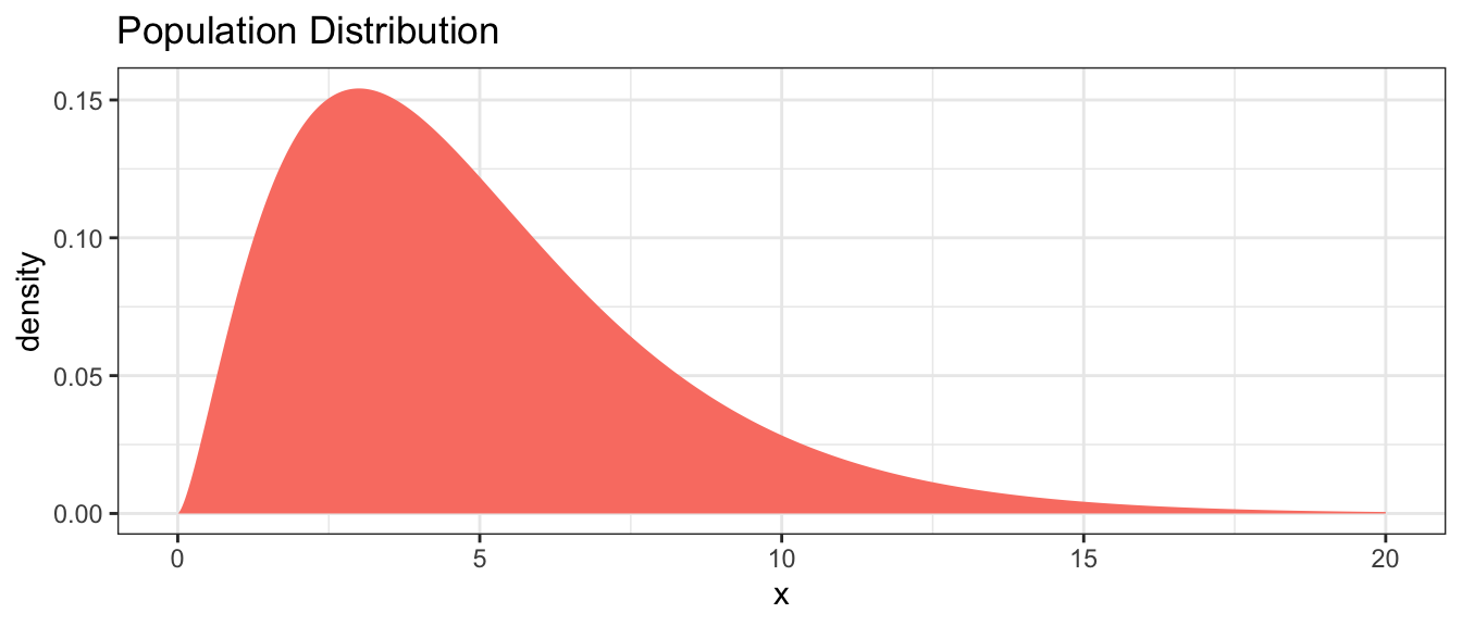 Suppose we are sampling from a population that has a mean of \(\mu=5\) and is skewed. For this example, I’ll use a Chi-squared distribution with parameter \(\nu=5\).