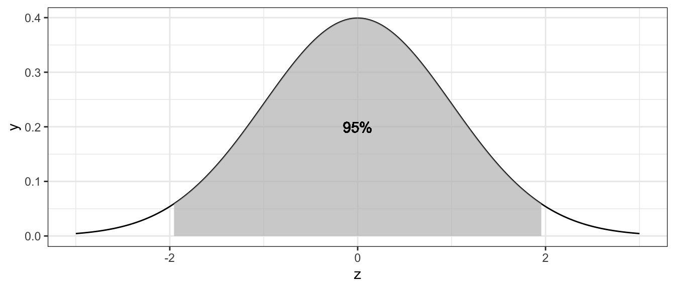 Next we look in our standard normal table to find a \(z\)-value such that \(P\left(-z\le Z\le z\right)=0.95\) and that value is \(z=1.96\).