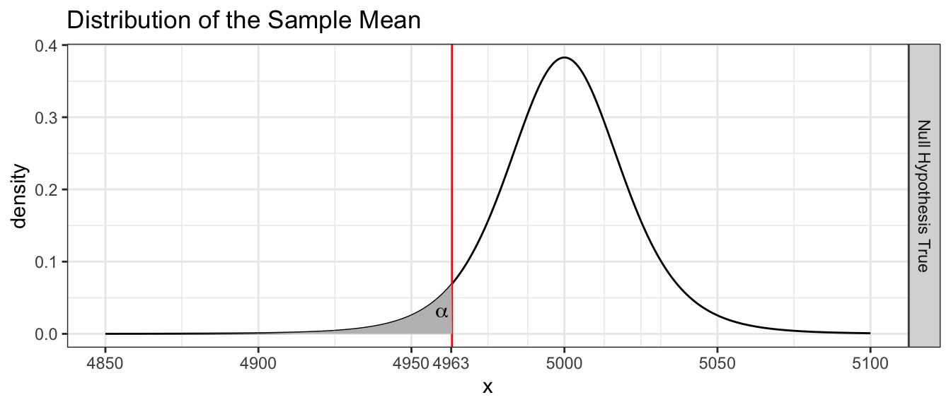 So I want to be able to detect if the true mean is less than \(4950\) pounds. Consider the following where we assume \(\mu=4950\).