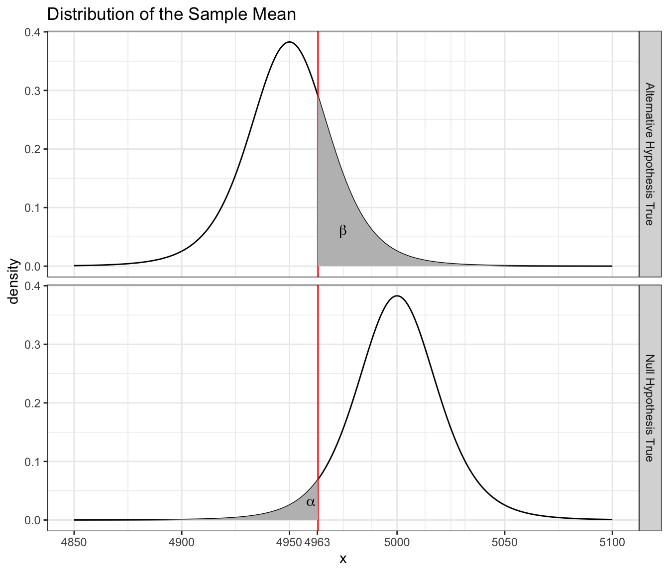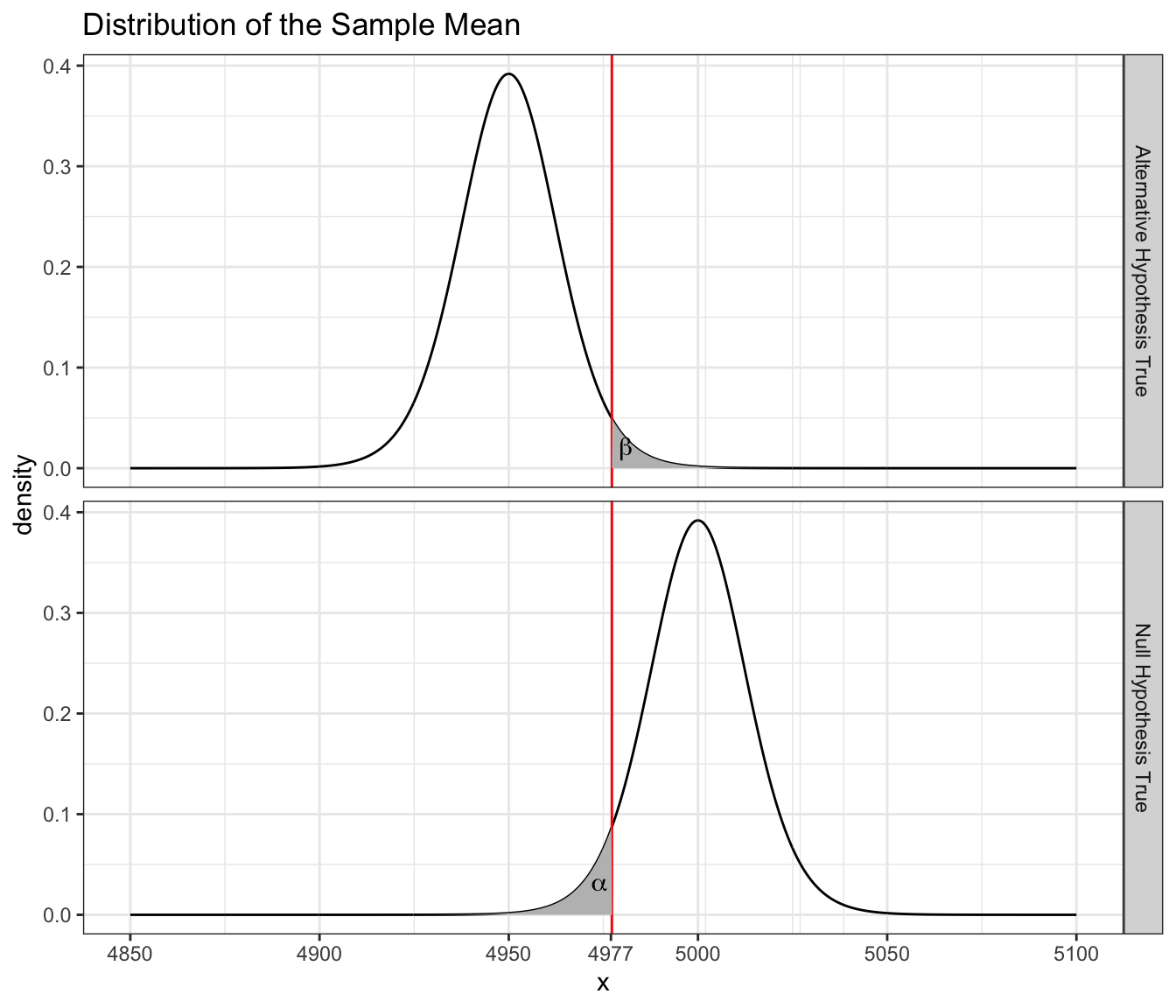 A type II error occurs when I fail to reject the null hypothesis when the alternative is true. This would mean that we would be selling ropes that have a breaking point less than the advertised amount. This opens the company up to a lawsuit. We denote the probability of making a Type II error is denoted as \(\beta\) and define Power \(=1-\beta\). But consider that I don’t want to be shutting down the plant when the breaking point is just a few pounds from the true mean. The head of engineering tells me that if the average breaking point is more than \(50\) pounds less than \(5000\), we have a problem, but less than \(50\) pounds is acceptable.