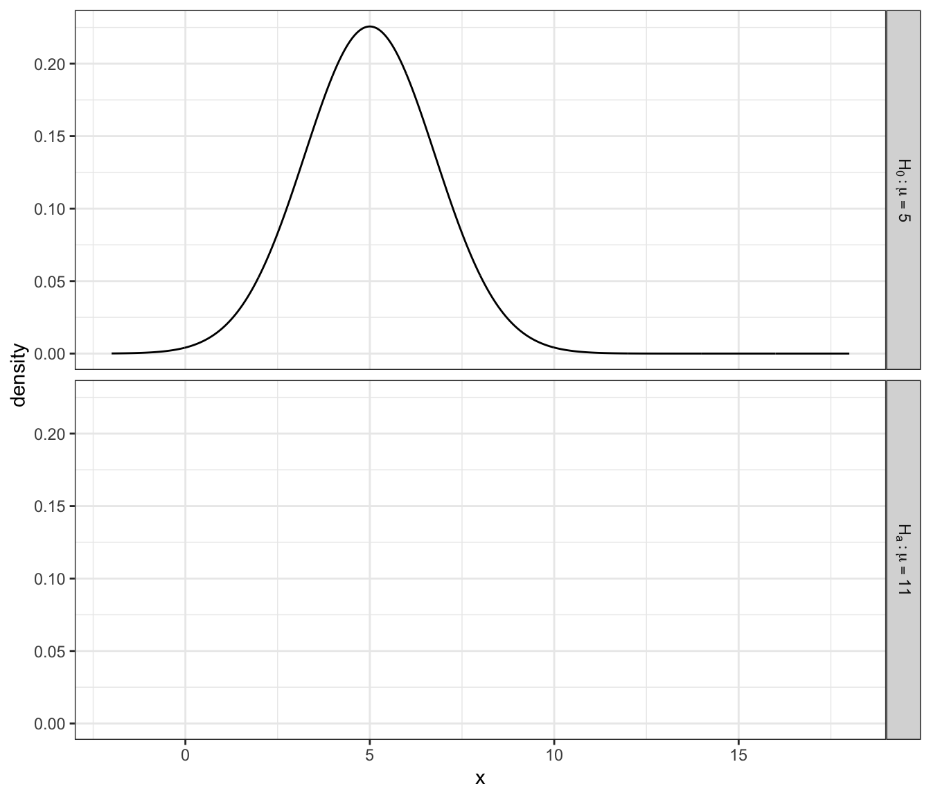 - Add the plot of the distribution of the sample mean if \(\mu=11\) and denote which areas represent \(\alpha\), \(\beta\), and the power in the figure below. I expect most people will print out the graph and shade/label everything by hand.