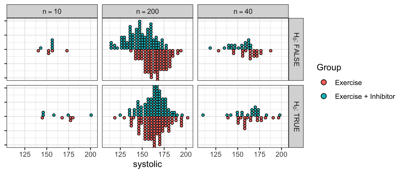 Instead of testing the entire population we’ll take a sample of \(n\) men from the population and treat half of them with exercise alone and half of them with exercise and ACE inhibitors. What might our data look like if there is a difference between the two treatments at different samples sizes compared to if there is no difference? At small sample sizes it is difficult to distinguish the effect of the treatment when it is masked by individual variation. At high sample sizes, the individual variation is smoothed out and the difference between the treatments can be readily seen.