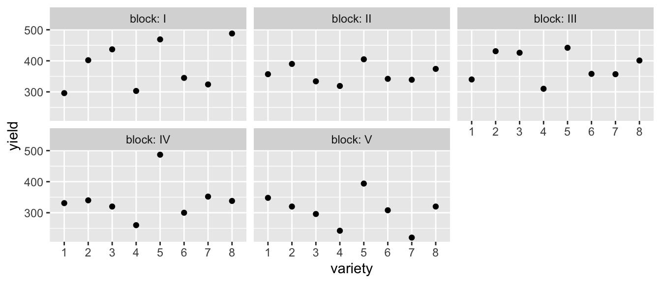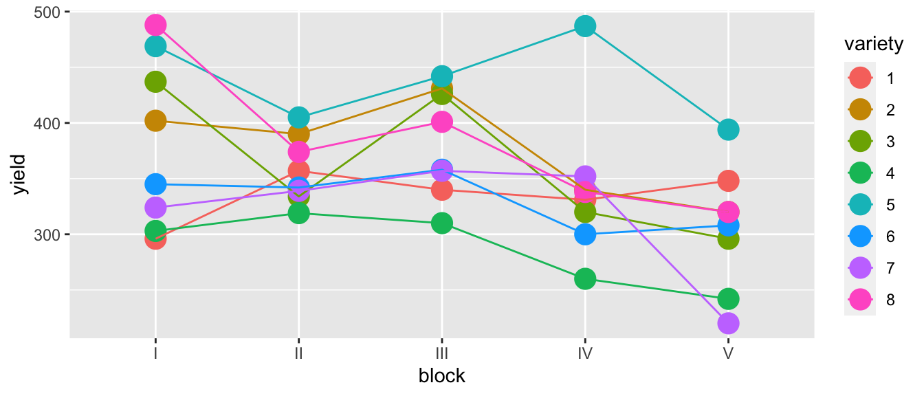 While there is one unusual observation in block IV, there doesn’t appear to be a blatant interaction. We will consider the interaction shortly. For the main effects model of yield ~ block + variety we have \(p=12\) parameters and \(28\) residual degrees of freedom because \[\begin{aligned} df_\epsilon &= n-p \\ &= n-\left(1+\left[\left(I-1\right)+\left(J-1\right)\right]\right) \\ &= 40-\left(1+\left[\left(5-1\right)+\left(8-1\right)\right]\right) \\ &= 40-12 \\ &= 28 \end{aligned}\]