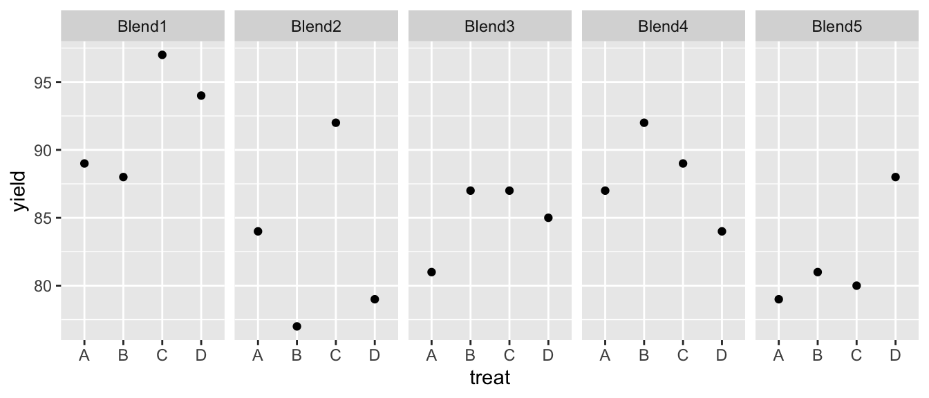 The dataset oatvar in the faraway library contains information about an experiment on eight different varieties of oats. The area in which the experiment was done had some systematic variability and the researchers divided the area up into five different blocks in which they felt the area inside a block was uniform while acknowledging that some blocks are likely superior to others for growing crops. Within each block, the researchers created eight plots and randomly assigned a variety to a plot. This type of design is called a Randomized Complete Block Design (RCBD) because each block contains all possible levels of the factor of primary interest.