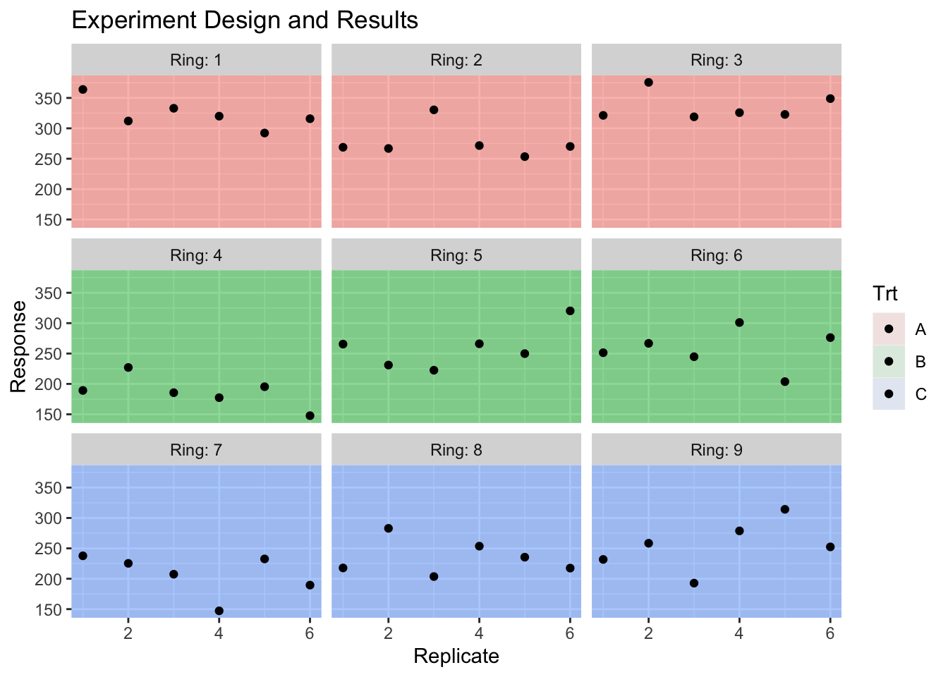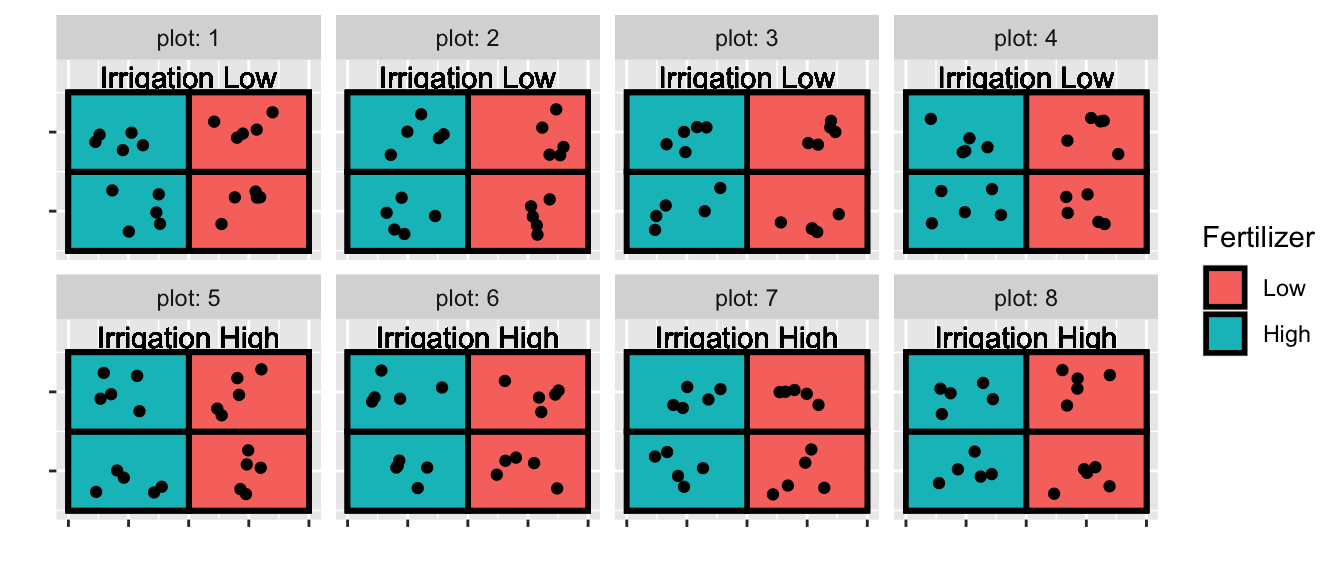 Example 1. An agricultural field study has three fields in which the researchers will evaluate the quality of three different varieties of barley. Due to how they harvest the barley, we can only create a maximum of three plots in each field. In this example we will block on field since there might be differences in soil type, drainage, etc from field to field. In each field, we will plant all three varieties so that we can tell the difference between varieties without the block effect of field confounding our inference. In this example, the varieties are nested within the fields.