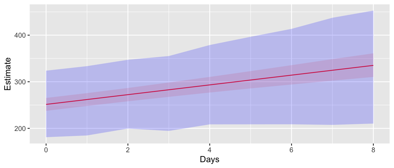 Now that we have a bootstrap data set, we need to take the data and then fit a model to the data and then grab the predictions from the model. At this point we are creating a confidence interval for the response line of a randomly selected person from the population. The lme4::bootMer function will create bootstrap data sets and then send those into the lmer function.