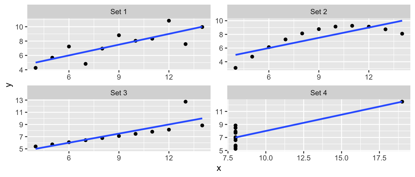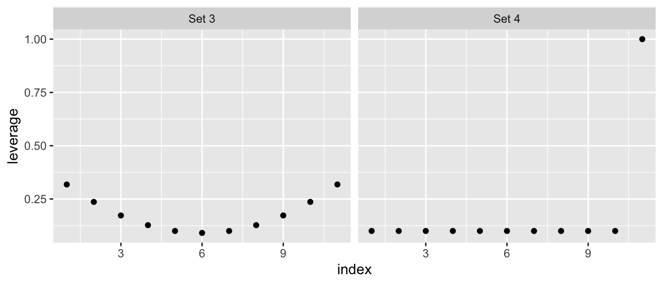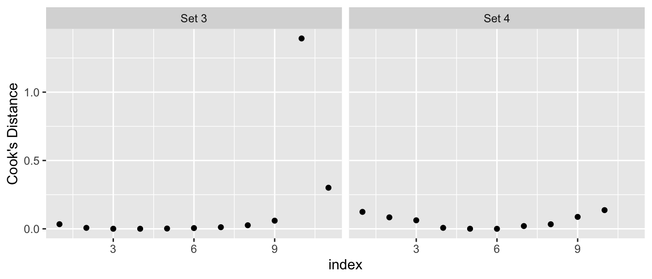 # Note: The high leverage point in set 4 has a Cook's distance of Infinity.