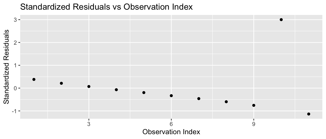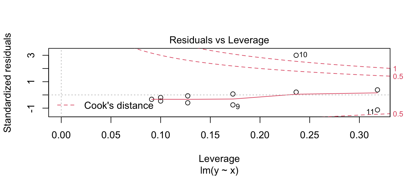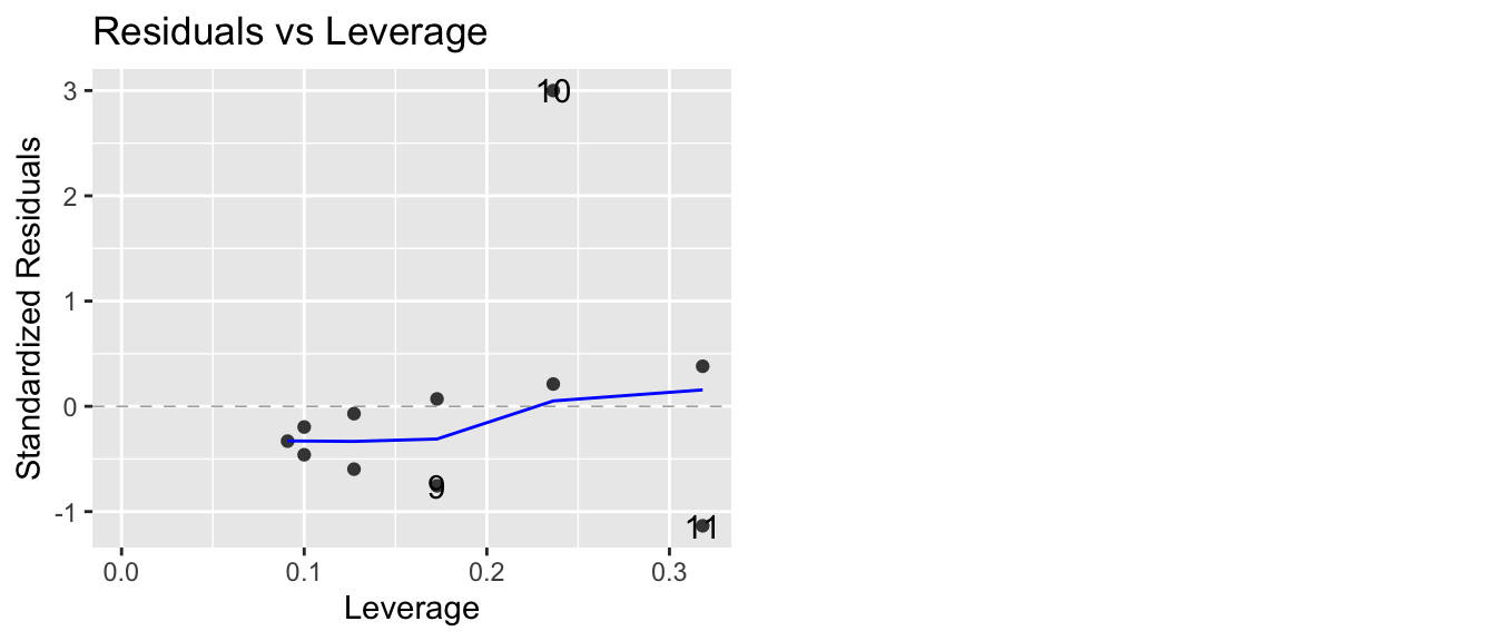 that one data point (observation 10) has an extremely large standardized residual. This is one plot where I prefer what the base graphics in R does compared to the ggfortify version. The base version of R adds some contour lines that mark where the contours of where Cook’s distance is 1/2 and 1.