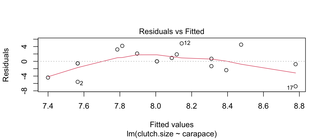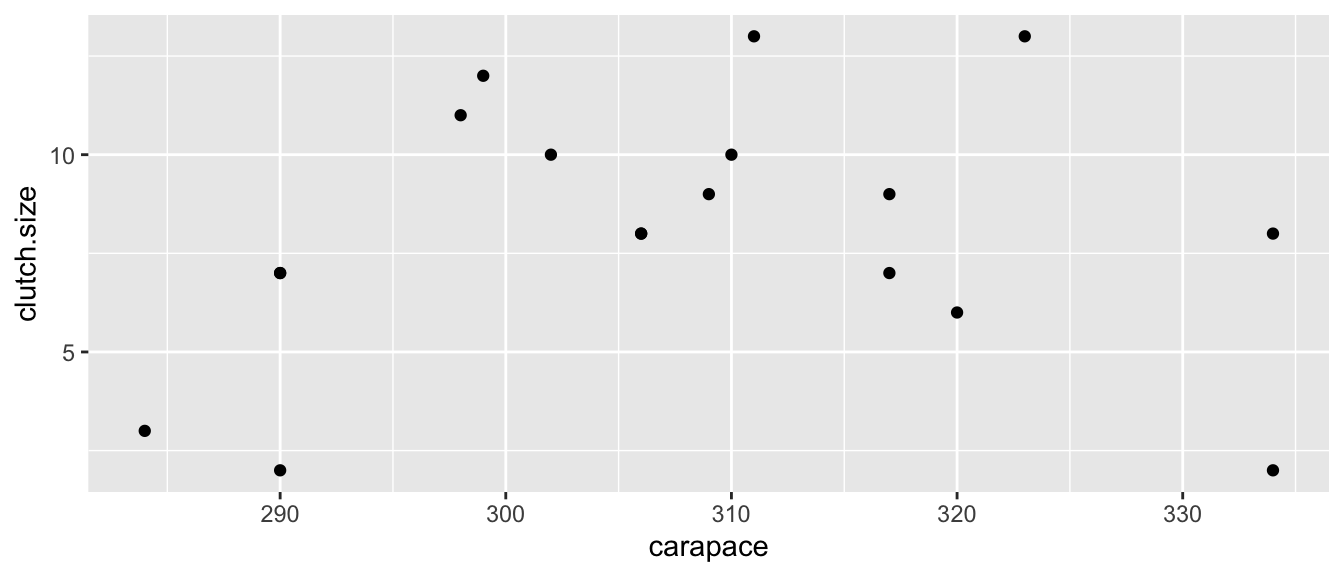 To explore how this plot can detect non-linear relationships between \(y\) and \(x\), we will examine a data set from Ashton et al. (2007) that relates the length of a tortoise’s carapace to the number of eggs laid in a clutch. The data are