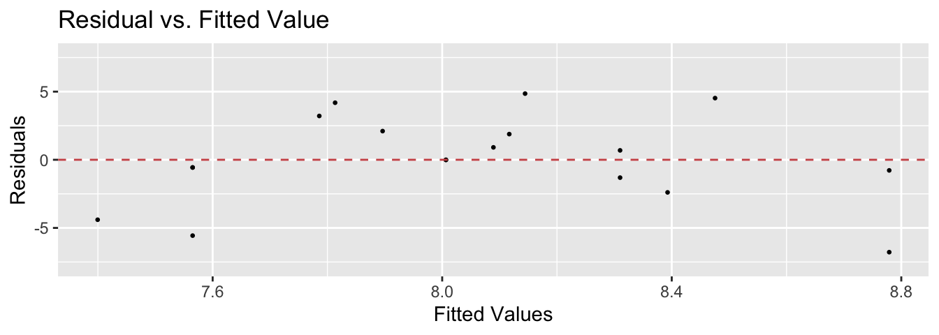 In the simple linear regression the most useful plot to look at was the residuals versus the \(x\)-covariate, but we also saw that this was similar to looking at the residuals versus the fitted values. In the general linear model, we will look at the residuals versus the fitted values or possibly the studentized residuals versus the fitted values.