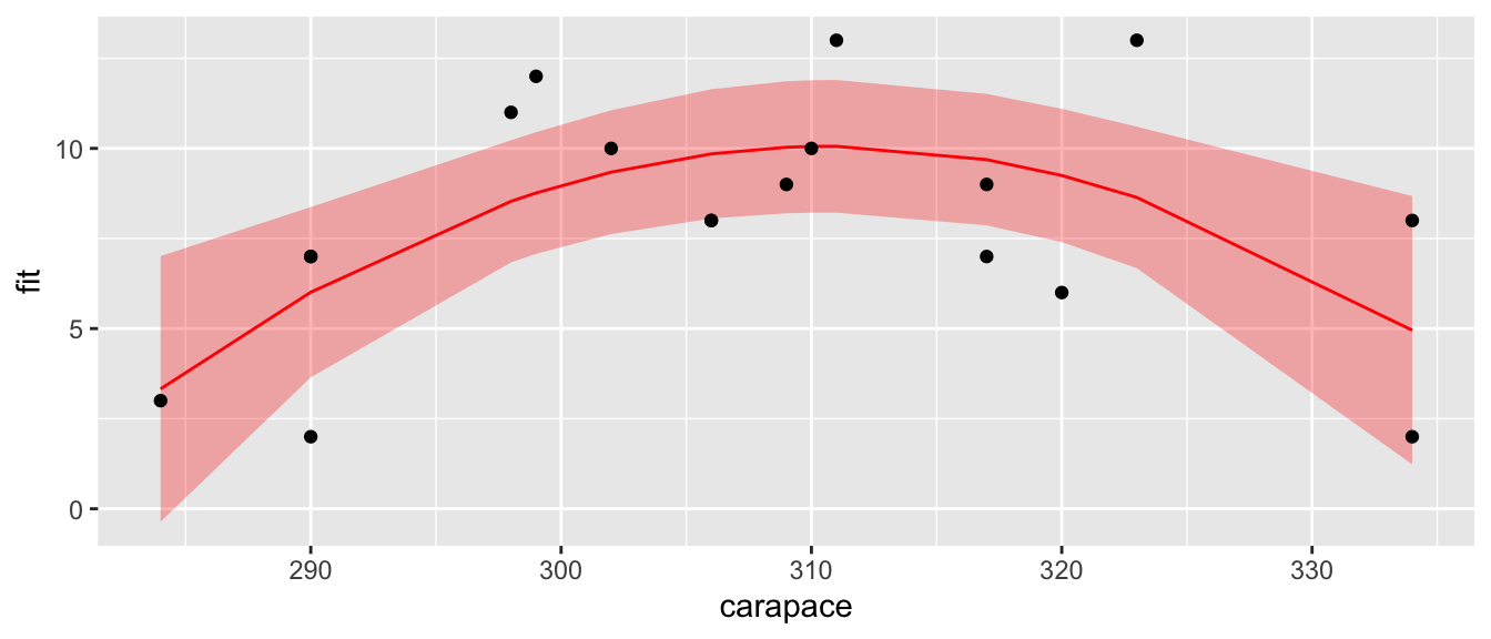model <- lm( clutch.size ~ carapace + I(carapace^2), data=Eggs )