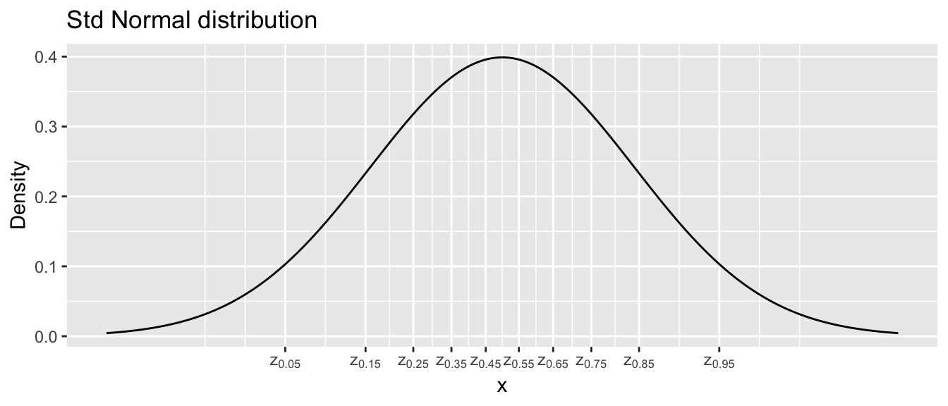 This idea needs a little modification because the largest observation cannot be near the \(100\)th percentile (because that is \(\infty\)). So we’ll adjust the estimates to still be spaced at \((1/n)\) quantile increments, but starting at the \(0.5/n\) quantile instead of the \(1/n\) quantile. So the smallest observation should be near the \(0.05\) quantile, the second smallest should be near the \(0.15\) quantile, and the largest observation should be near the \(0.95\) quantile. I will refer to these as the theoretical quantiles.