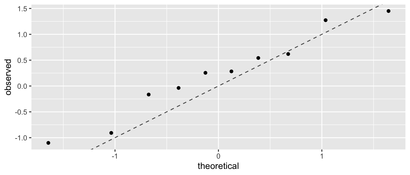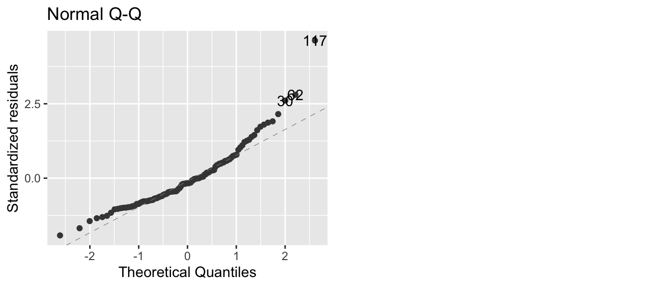 In this case, we have a large number of residuals that are bigger than I would expect them to be based on them being from a normal distribution. We could further test this using the Shapiro-Wilks test and compare the standardized residuals against a \(N\left(0,1\right)\) distribution.