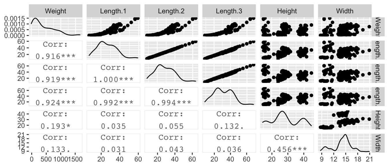 dplyr::select(Weight, Length.1, Length.2, Length.3, Height, Width) %>%