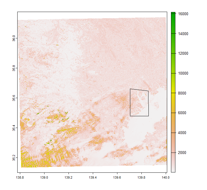 両データをplotしたところ、今回取得したデータは分析対象領域以外の領域も含んでいることが分かりました。分析対象領域に絞ったデータが欲しいため、cropとmaskを行います。