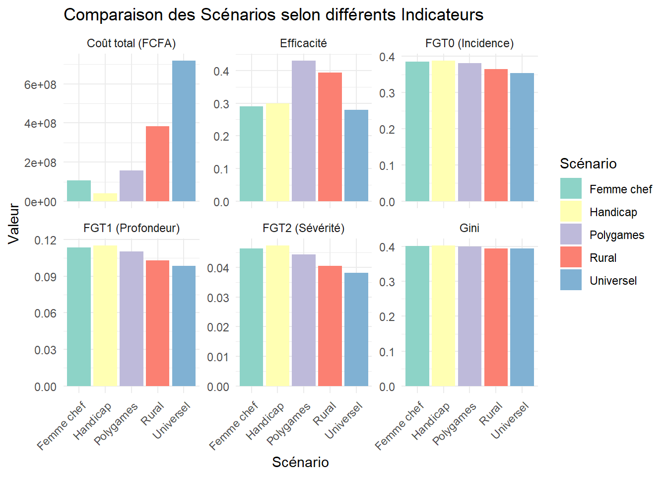 | Scénario | FGT0 (Incidence) | FGT1 (Profondeur) | FGT2 (Sévérité) | Gini | Coût total (FCFA) | Efficacité |
