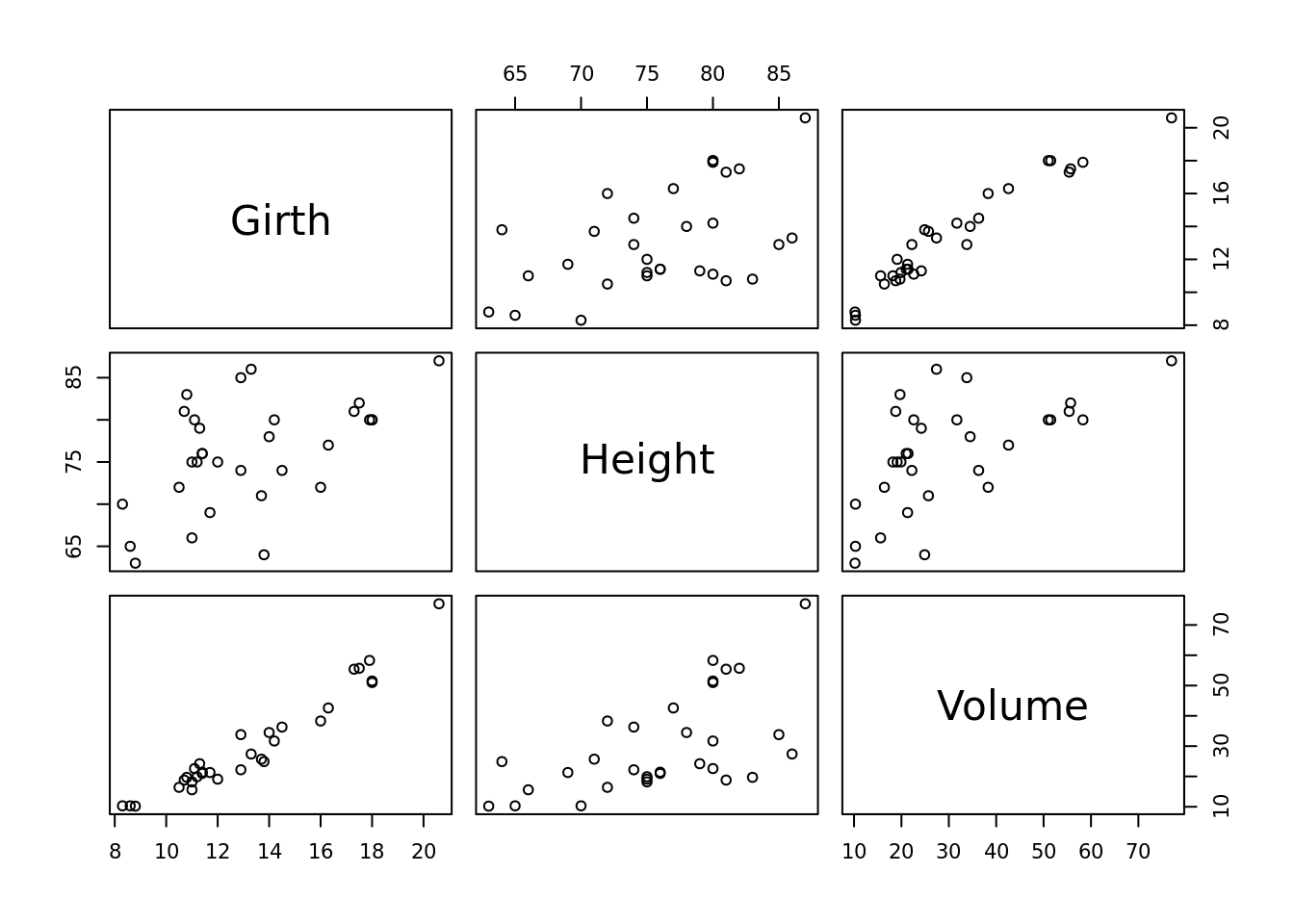Vemos que tiene tres columnas «Girth», «Height» y «Volume» (circumferencia, alto y volumen), los que, por lógica, deben tener alta correlación. Graficamos dos de ellos.