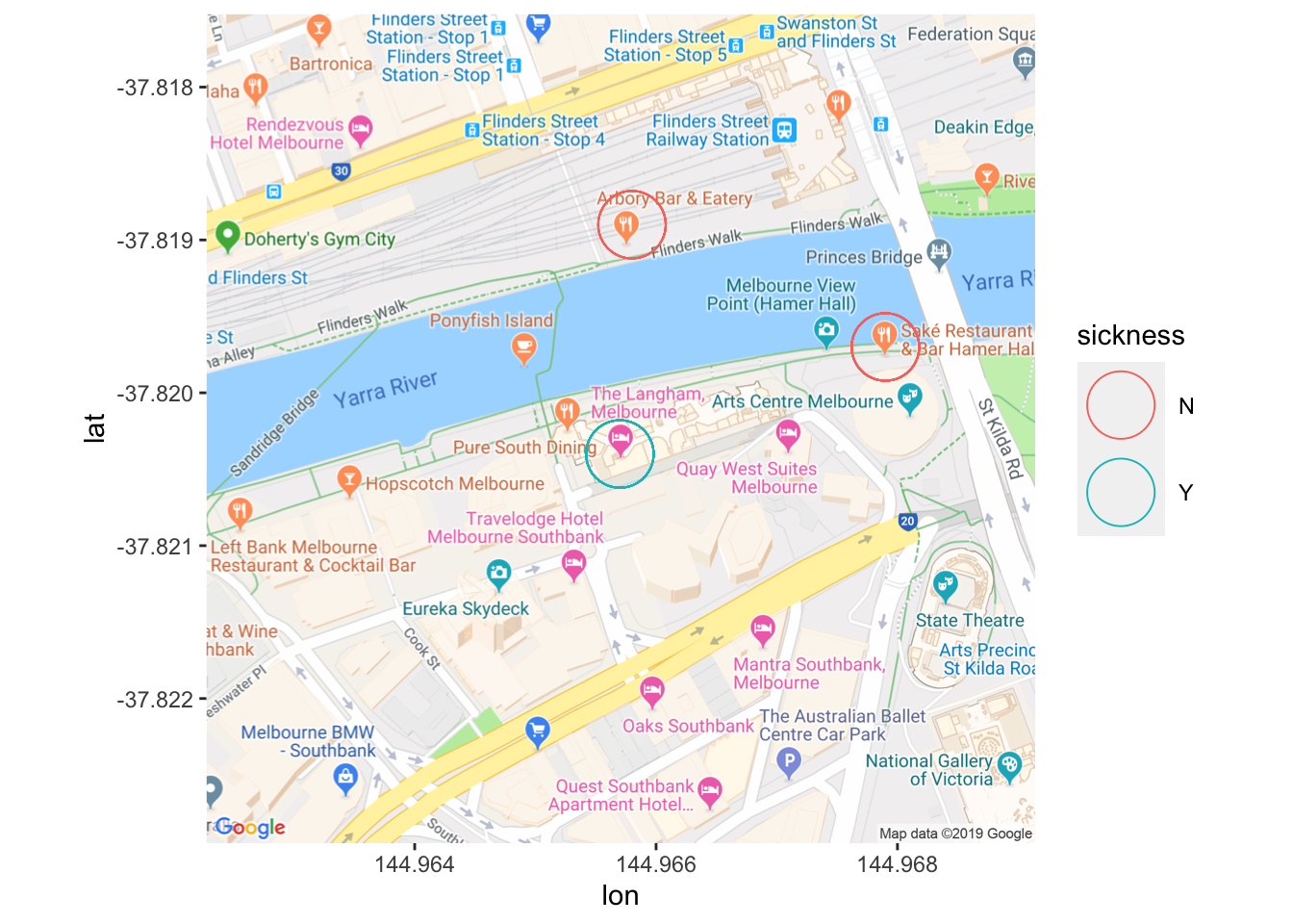 + geom_point(data=map_data, aes(x =long, y = lat, colour = sickness), size = 12, shape = 1)