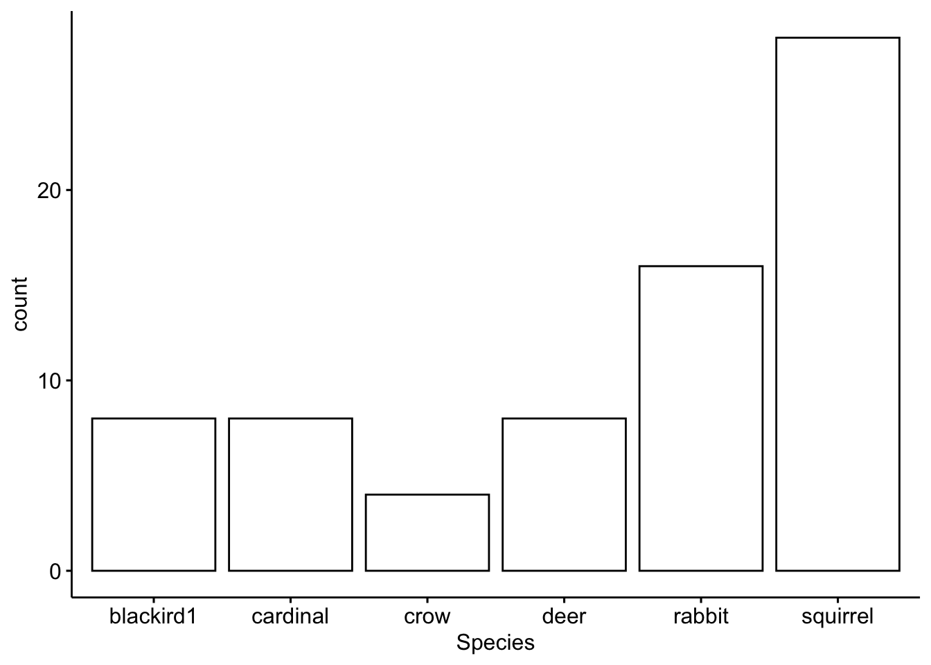 unique(MyCensusDataSiteB$Species)## [1] squirrel blackird1 rabbit deer crow