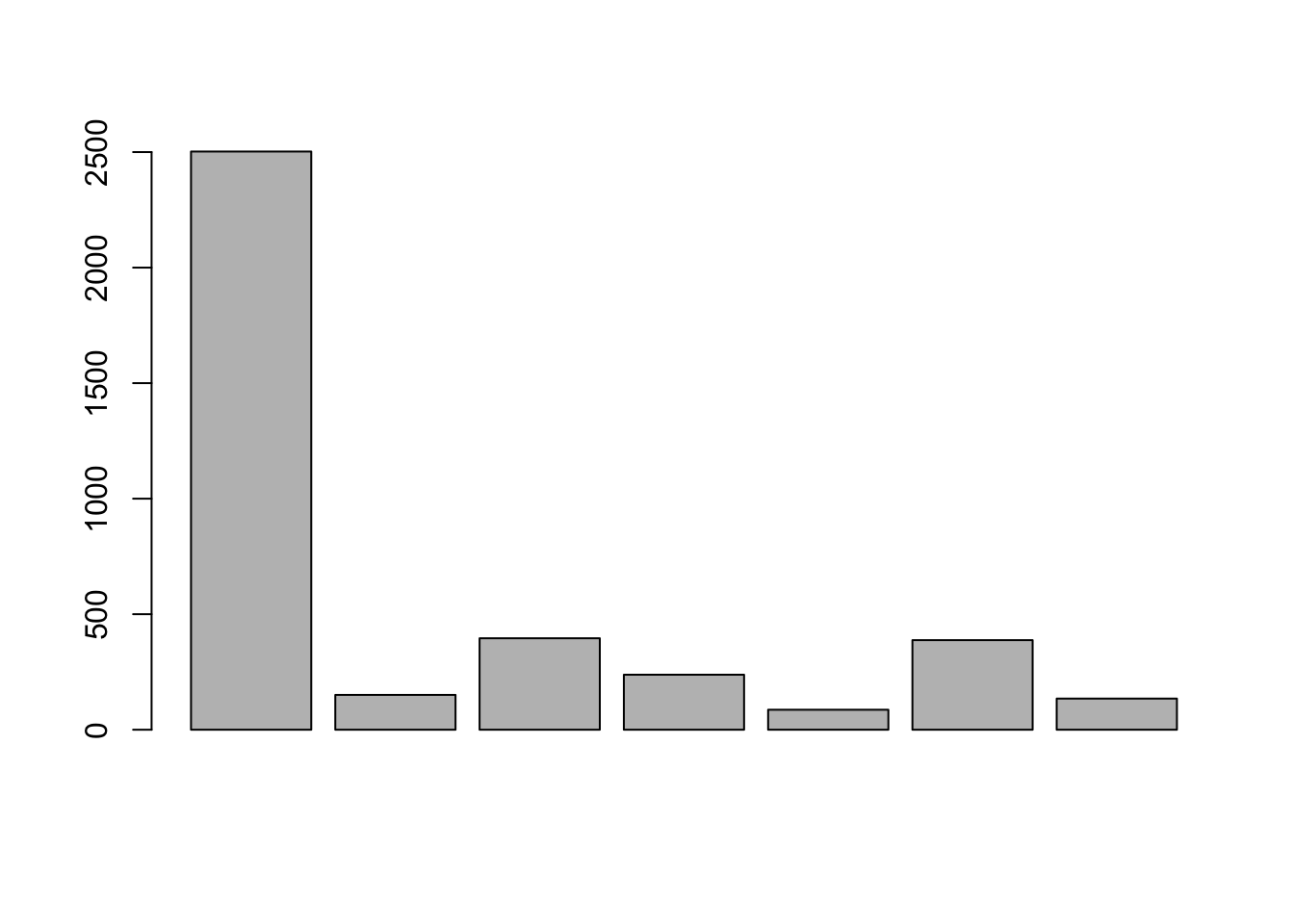 The barplot default is a vertical bar graph with black borders and gray filling. The bar graph is drawn in the same order as the data frame entries.