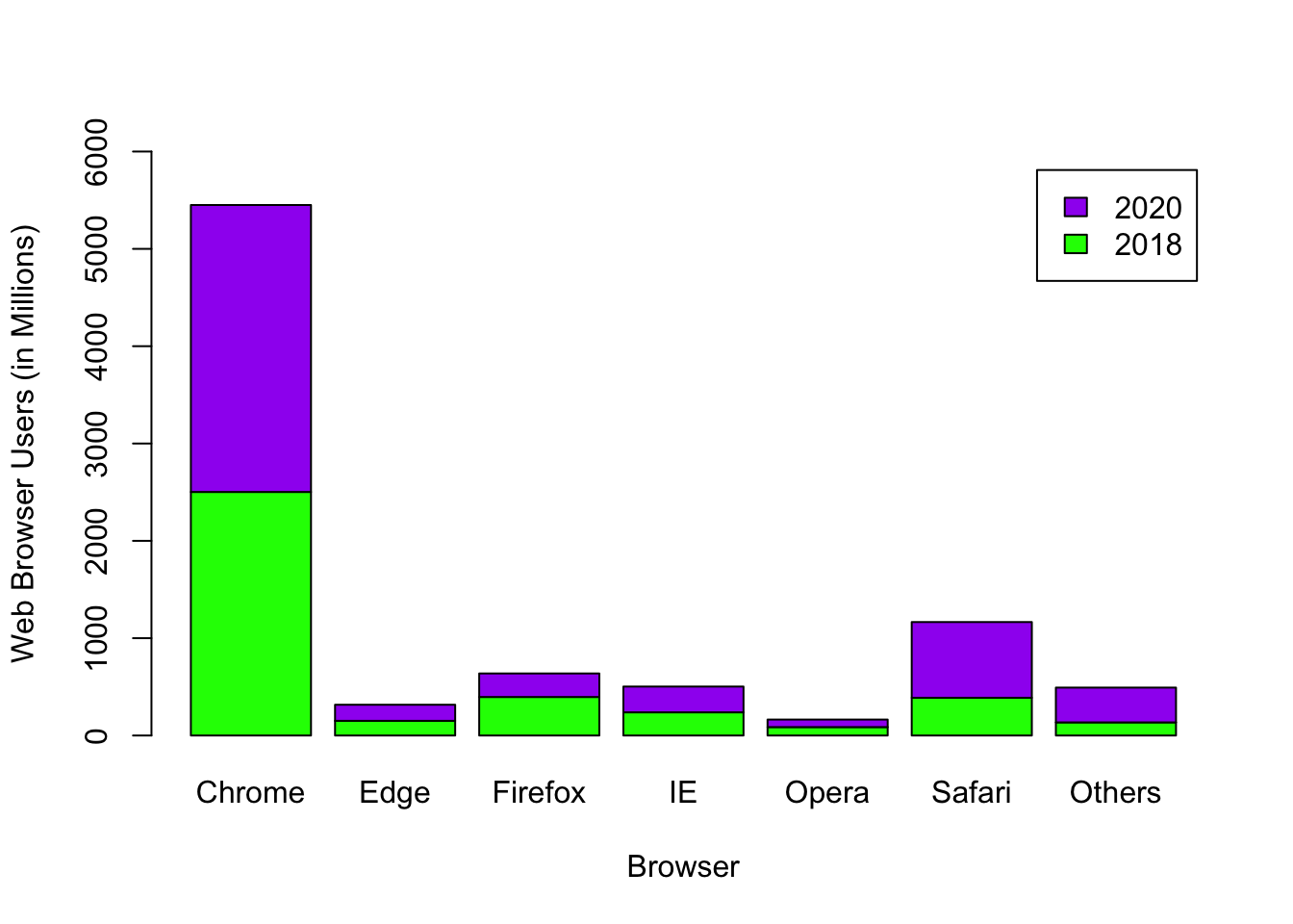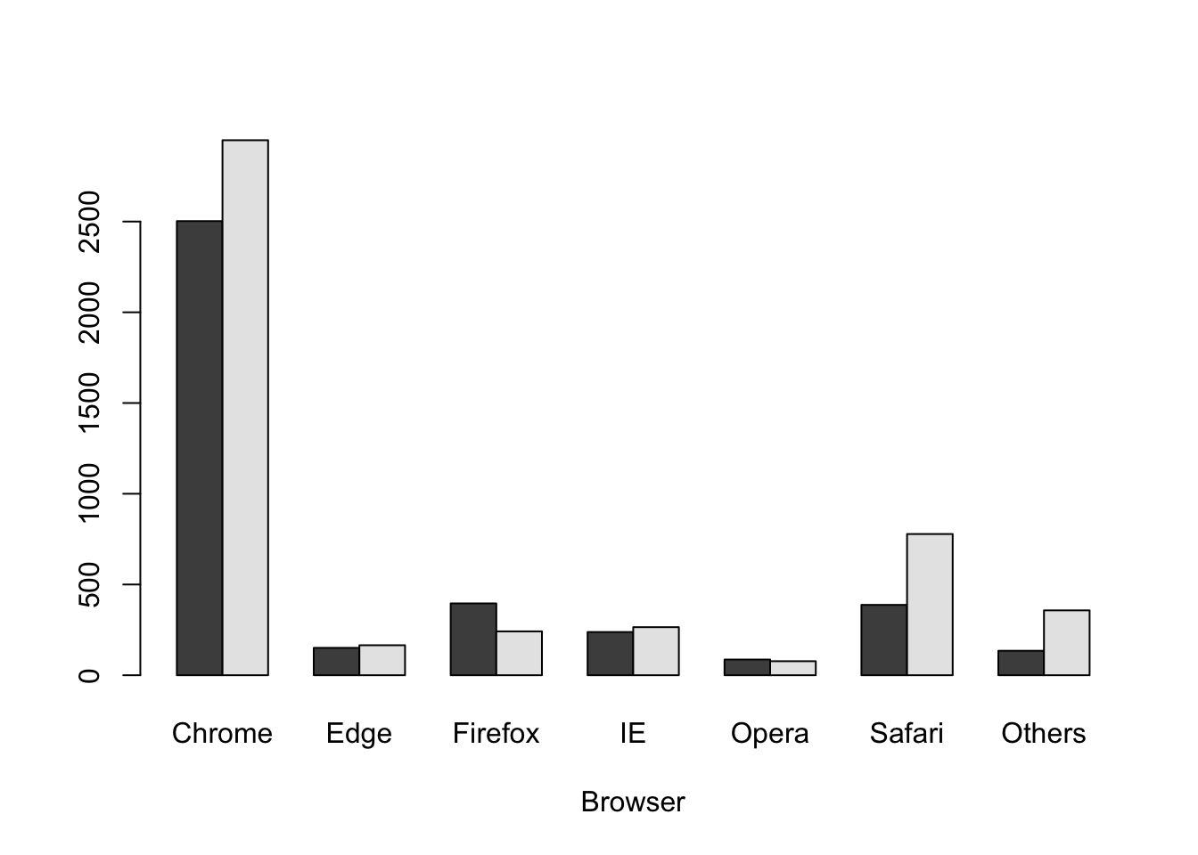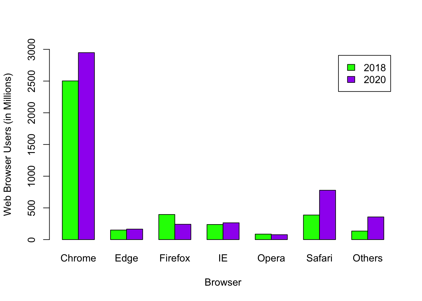 Suppose we want to compare web browser usage between 2018 and 2020, sorted by web browser. A side-by-side bar graph would be a perfect graph to use. Be sure to include the argument, beside = TRUE, so that the graph comes out side-by-side.
