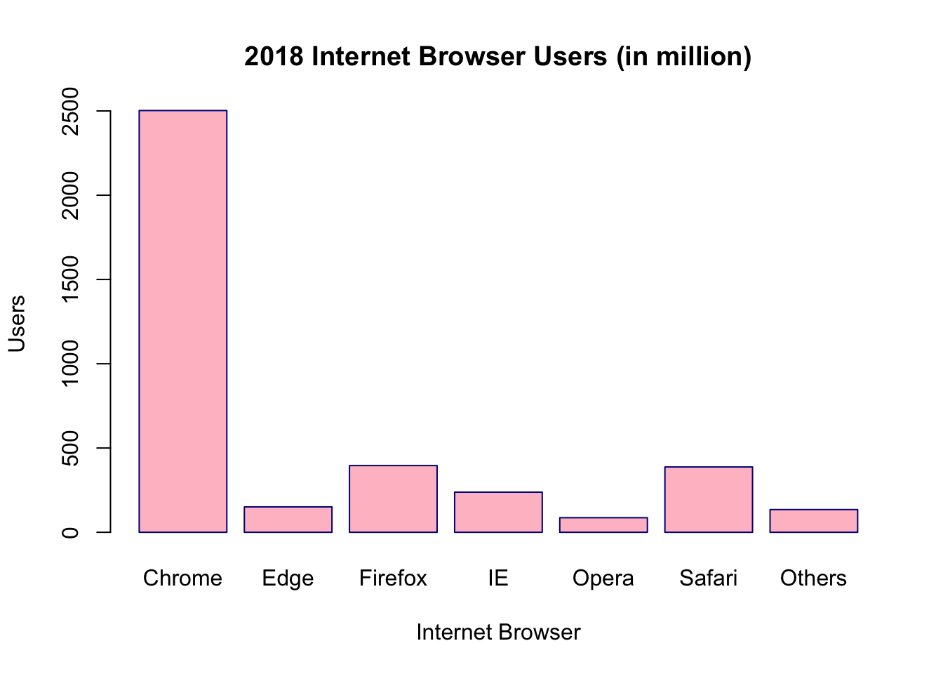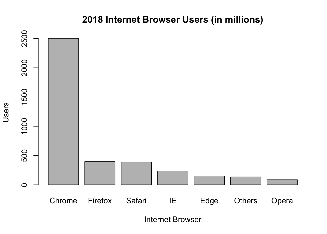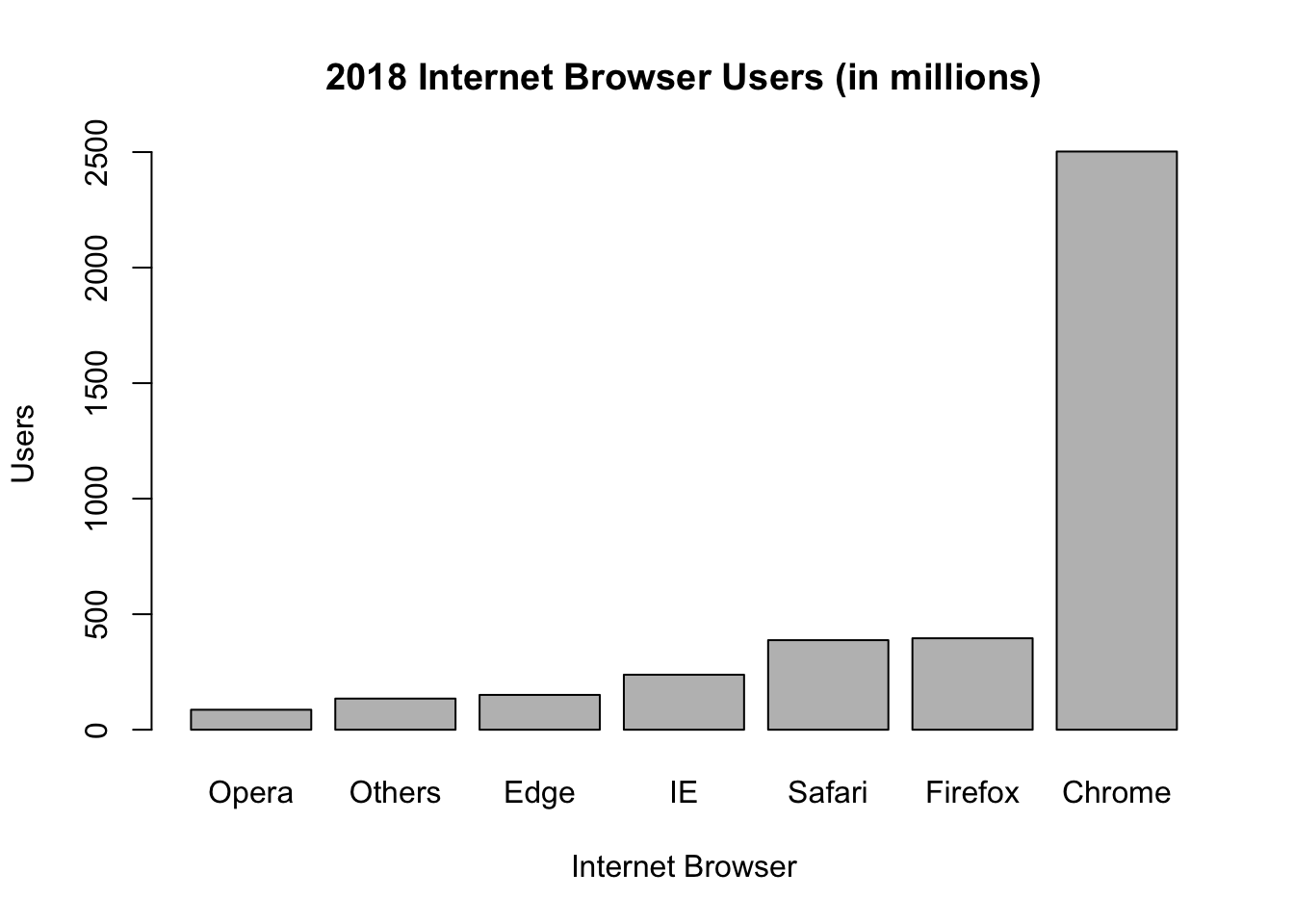Suppose we want to compare web browser usage between 2018 and 2020, sorted by web browser. A side-by-side bar graph would be a perfect graph to use. Be sure to include the argument, beside = TRUE, so that the graph comes out side-by-side.