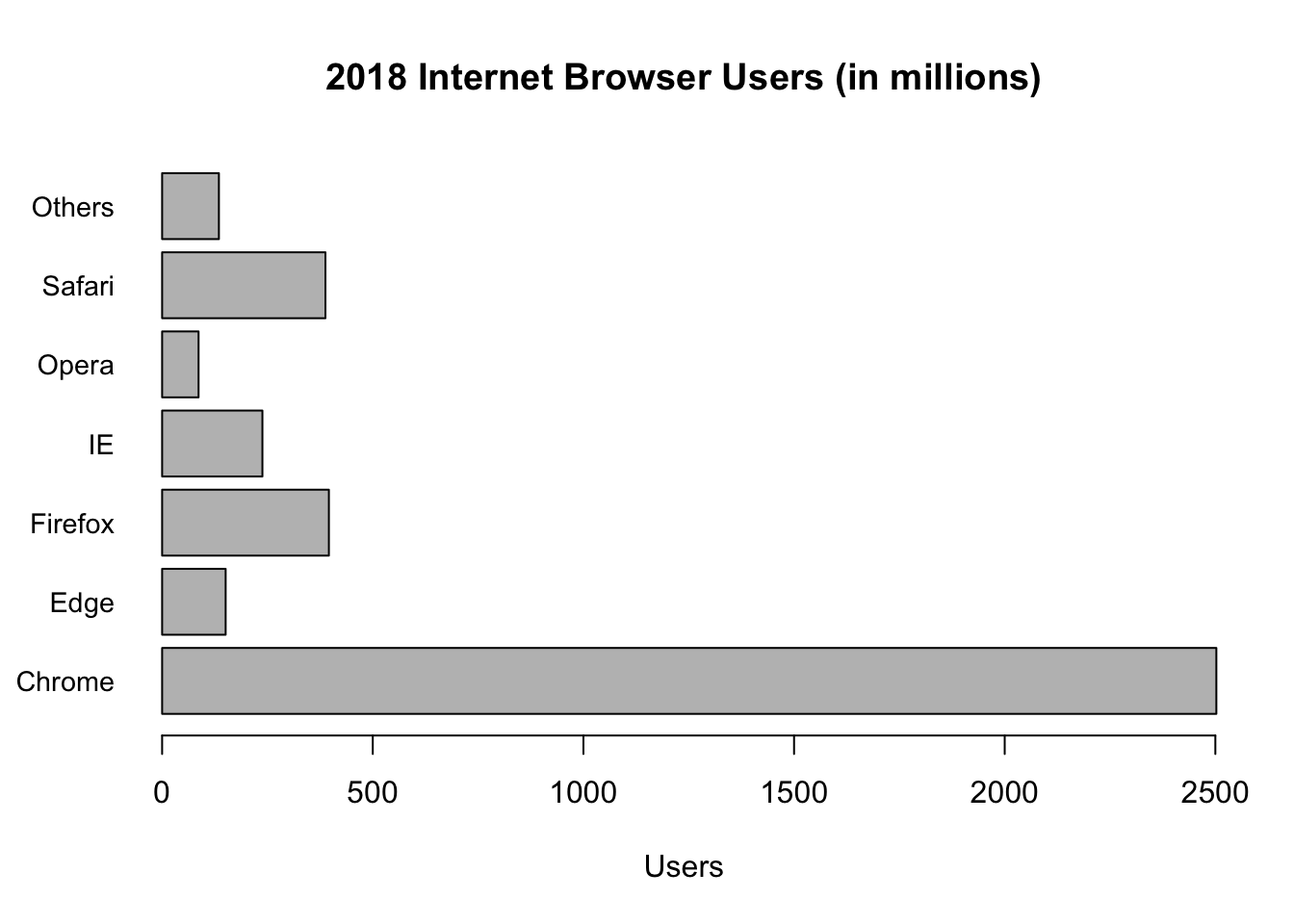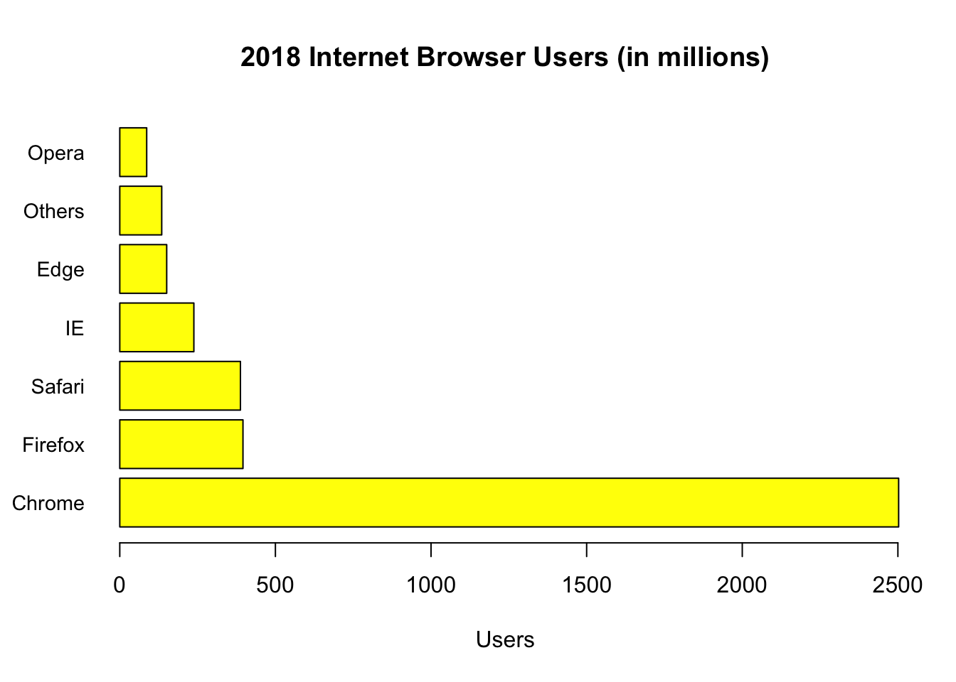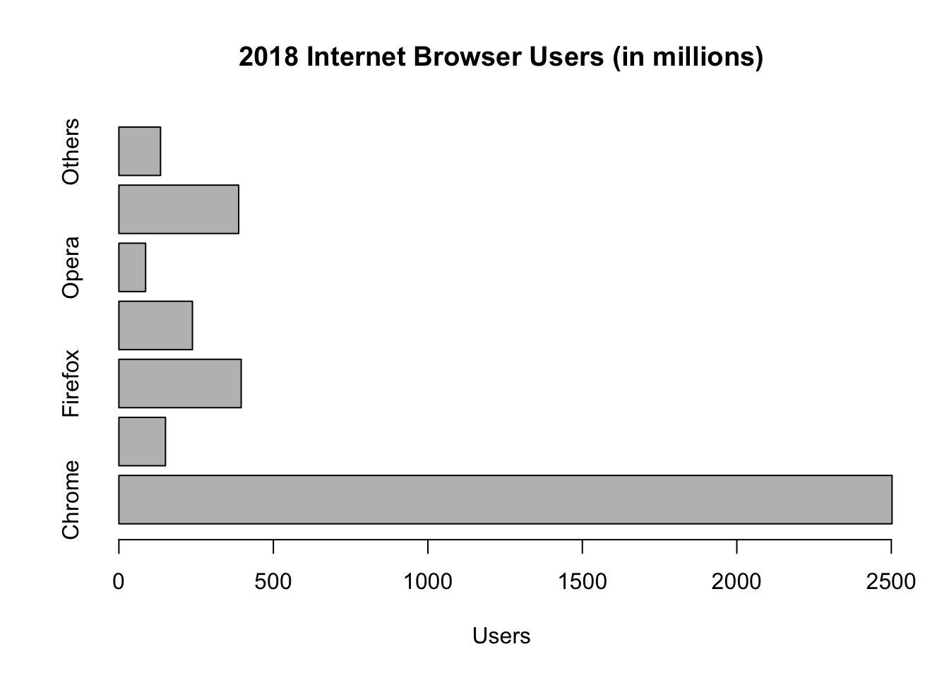 Notice that the y-axis label default is parallel to the axis. Notice also that some of the browsers have names longer than the height of the bar graph. Therefore, not all the names can fit on the graph and be shown.