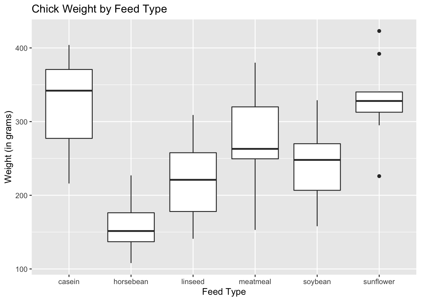 Let us look at the dataset built into R called chickwts. This dataset shows the chick weight, in grams, 6 weeks after newly hatched chicks were randomly placed into six groups by feed type. The dataset has 2 variables, weight and feed. The variable, weight, is quantitative while the variable, feed, is categorical.