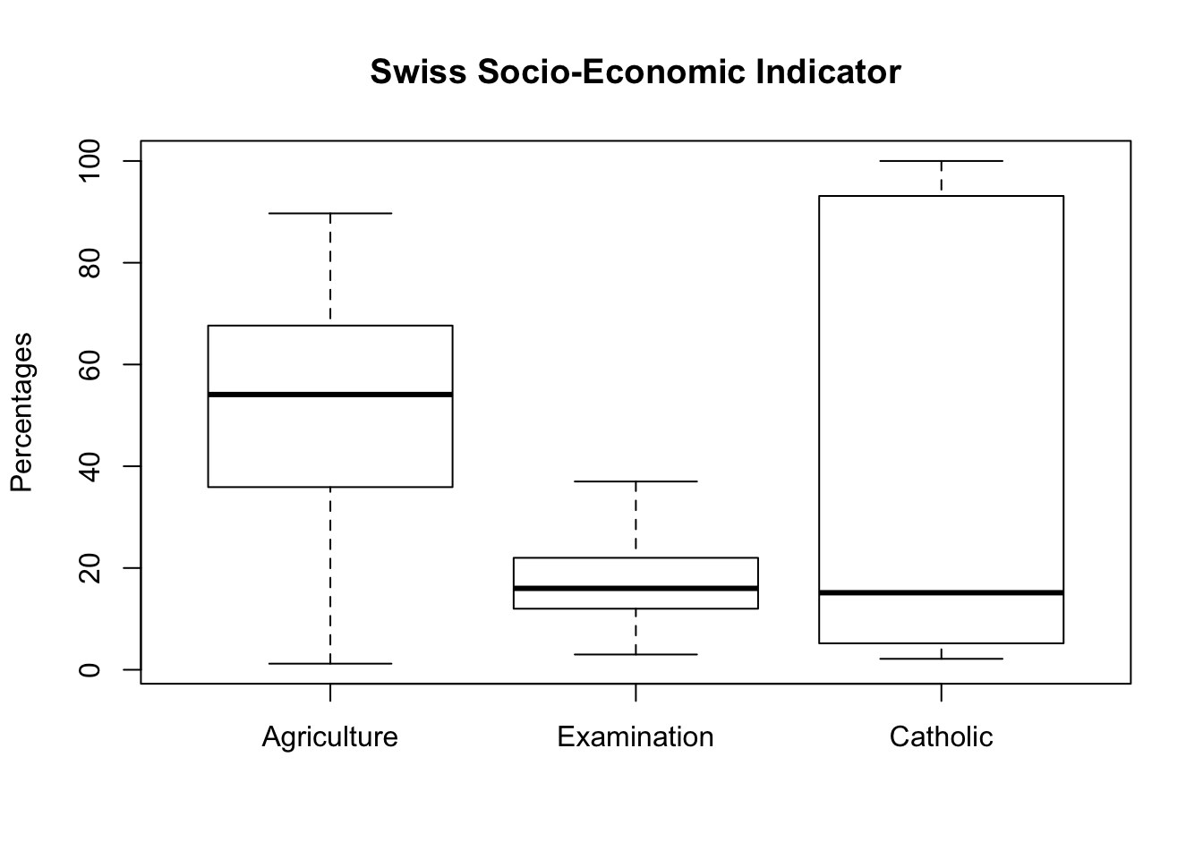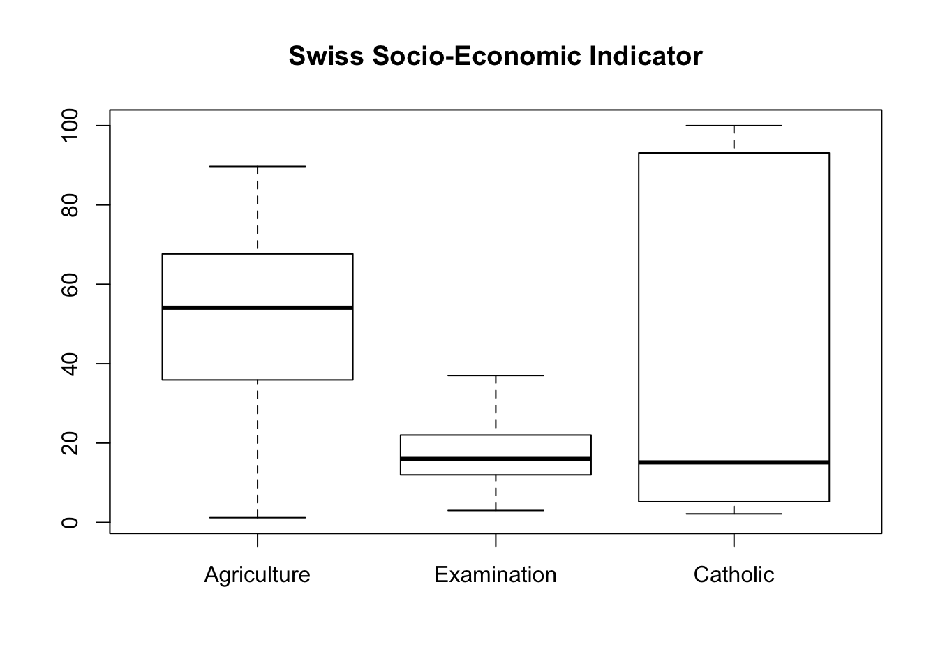 Let us look at the dataset called swiss. This is a dataset on the fertility and socio-economic measures for the French-speaking provinces of Switzerland. For our boxplot, we will be comparing the socio-economic indicators Agriculture (% of males involved in agriculture as an occupation), Examination (% of draftees receiving highest mark on the army examination) and Catholic (% of Catholics).