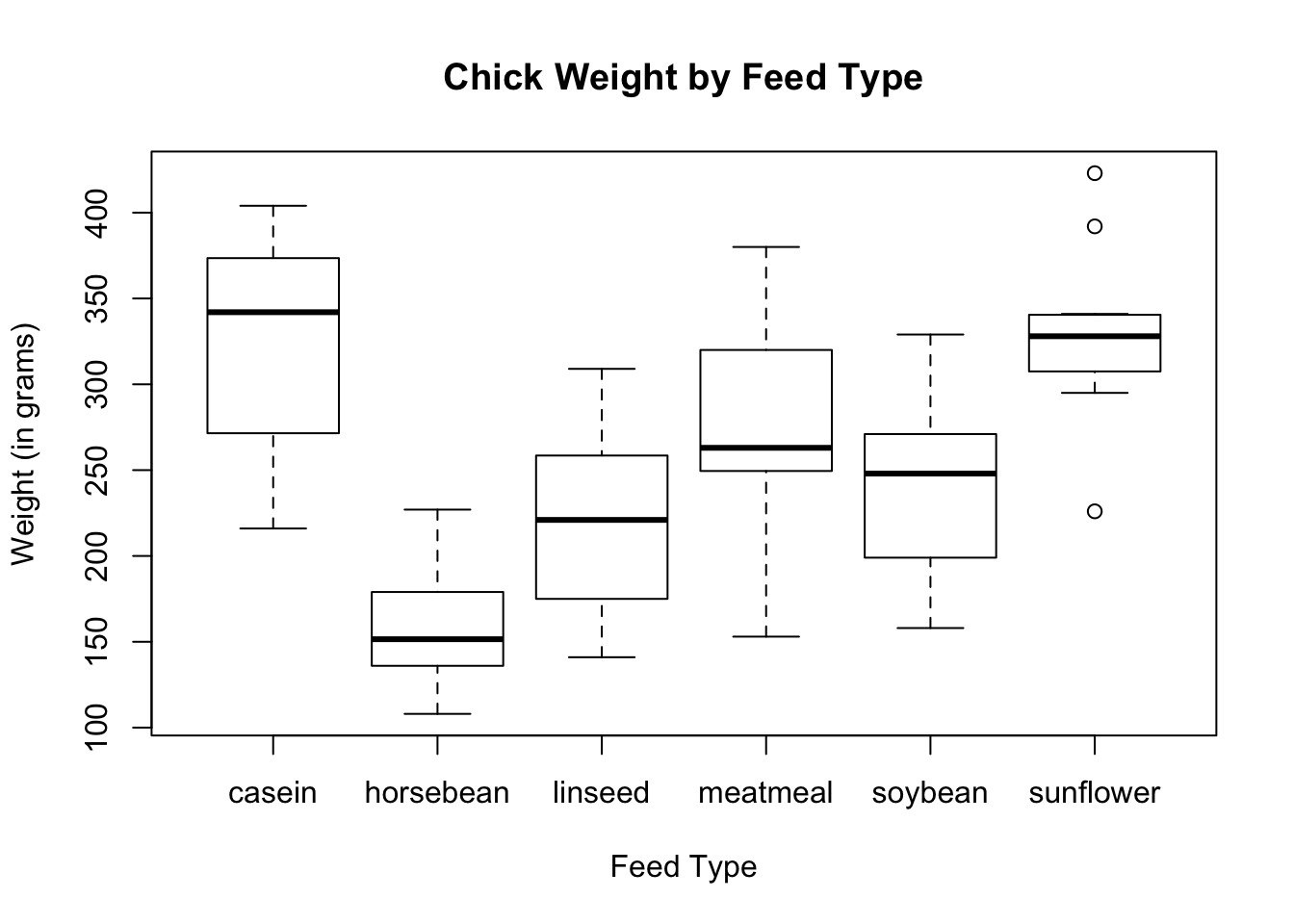 Let us draw a boxplot of the chick weights grouped by feed type.
