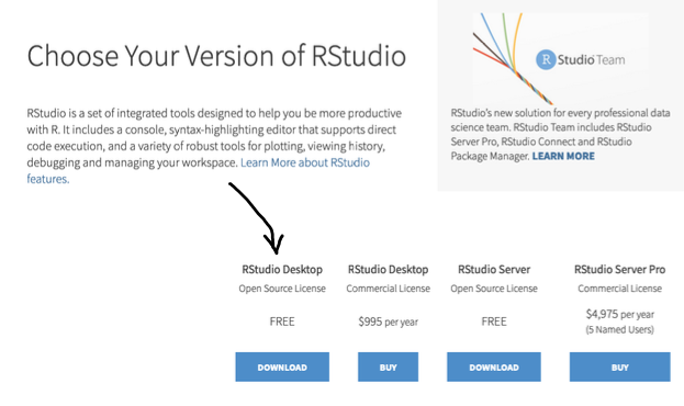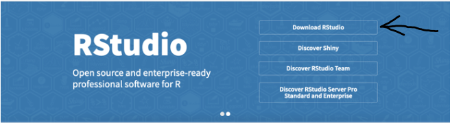 Next, download desktop RStudio in order to have the tools to work with R in a user-friendly environment. To download, go to rstudio.com. Once on the home page, click “Download RStudio.”