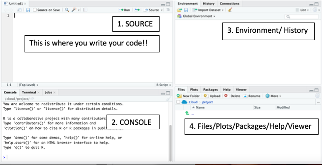 When you open RStudio, you will see the following four panels (sometimes also called panes or windows). Note: The panels you see may be in a different order than those shown below. You can rearrange the order of the windows under RStudio preferences. You can also change their shape by either clicking the minimize or maximize buttons on the top right corner of each panel, or by clicking and dragging the middle of the borders of the windows.