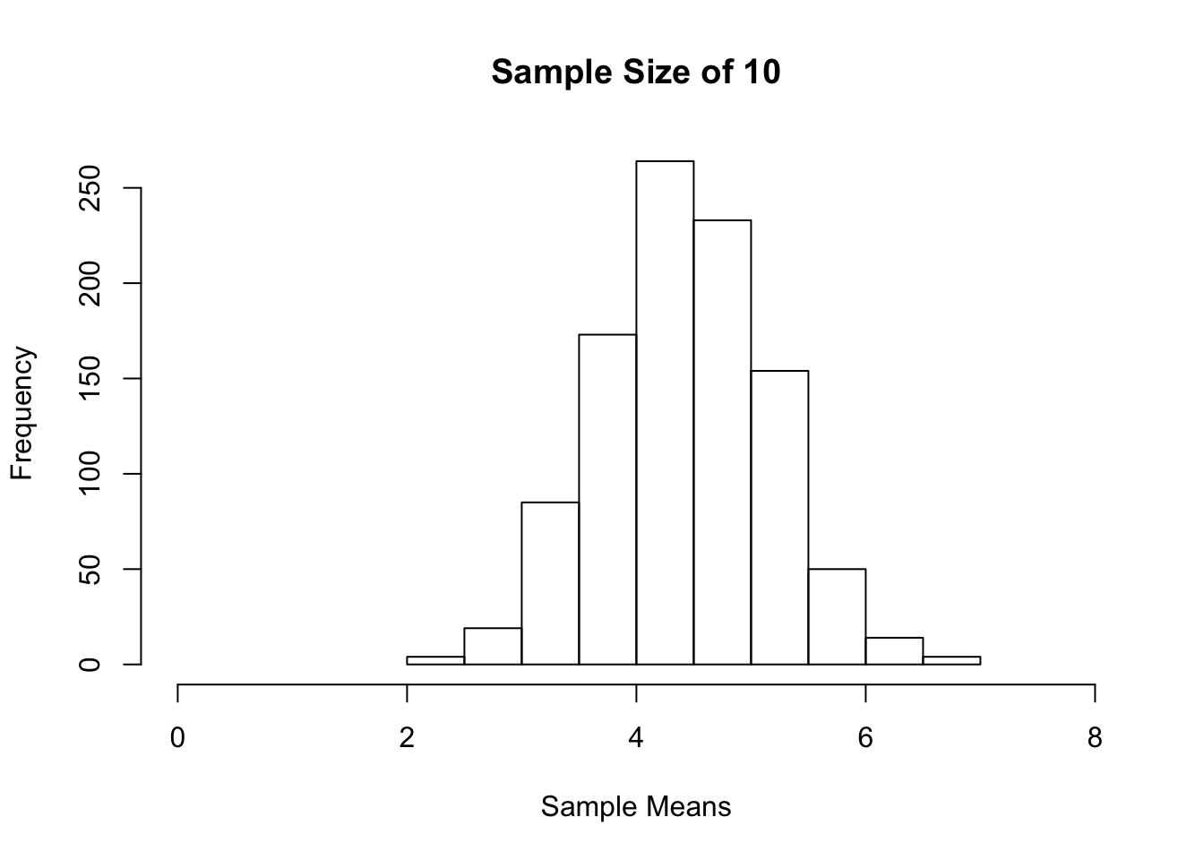 hist(sample_means, xlim = c(0,8), main = "Sample Size of 10", xlab = "Sample Means")