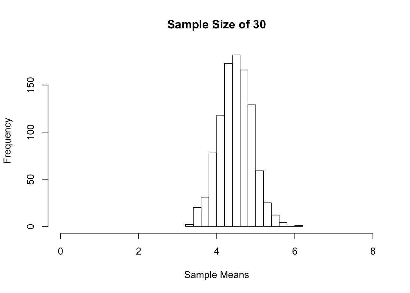 hist(sample_means, xlim = c(0,8), main = "Sample Size of 30", xlab = "Sample Means")
