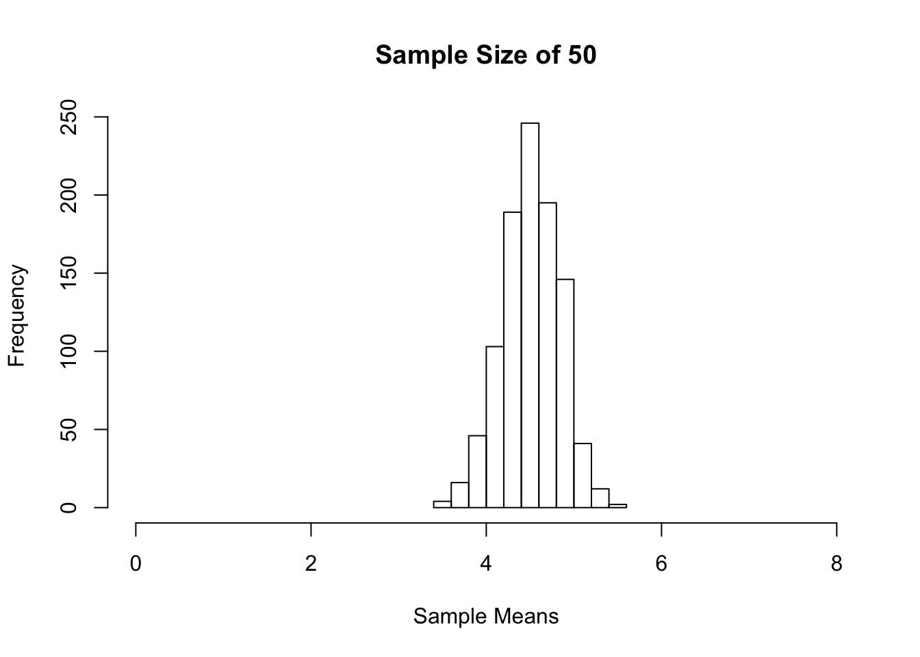 hist(sample_means, xlim = c(0,8), main = "Sample Size of 50", xlab = "Sample Means")