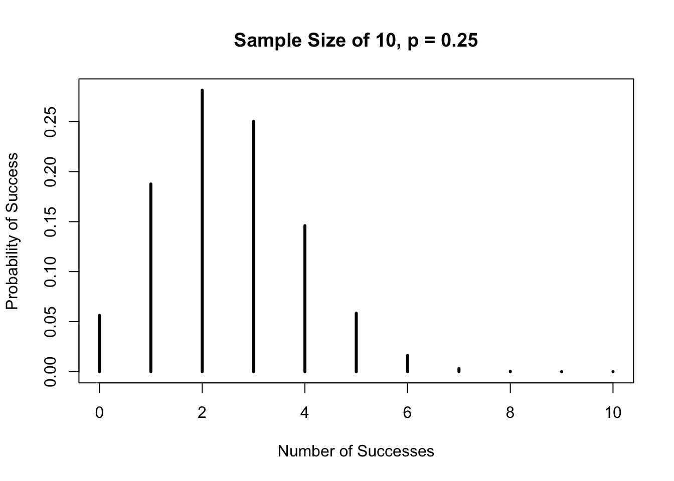 plot(success, dbinom(success, size = 10, prob = 0.25),
