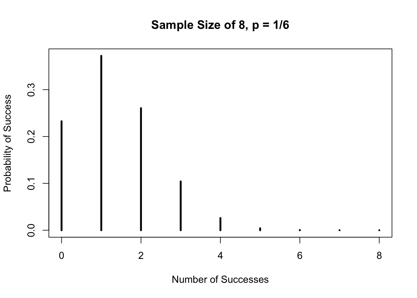 Suppose a fair die is rolled 8 times. Success is if a “2” is rolled and failure is if all the other numbers are rolled. The probability of getting a “2” in one roll is 1/6 or 0.17. Let us take a look at the graph of this distribution.