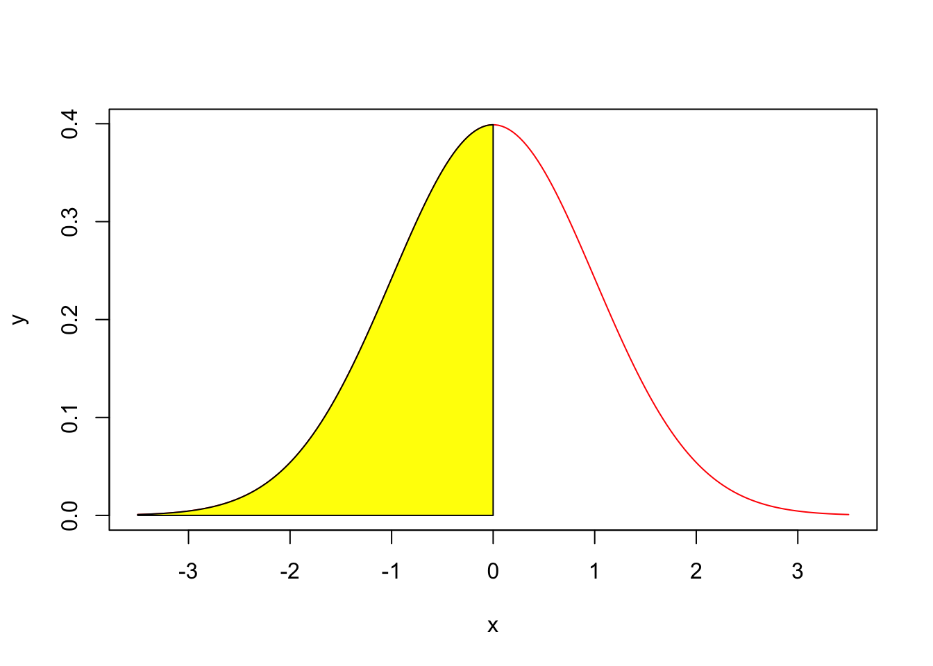 Let us look at an example. On the normal curve, the area to the left of 0 with a mean of 0 and standard deviation of 1 is 0.5.