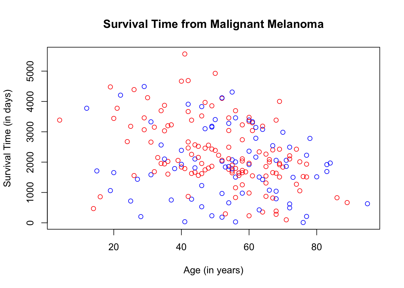 col = ifelse(Melanoma$sex == "1", "blue", "red"))