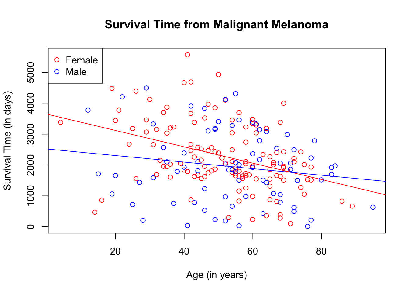 We learned how to draw a single set of scatterplot and regression line. We will now learn how to draw two sets of scatterplots and regression lines using the dataset called, Melanoma, which is found in the package, MASS. This is a data frame on 205 patients in Denmark with malignant melanoma. There are quite a few variables in this dataset. However, we will only be focusing on the variables age, for age of the patient in years and time, for their survival time, in days.