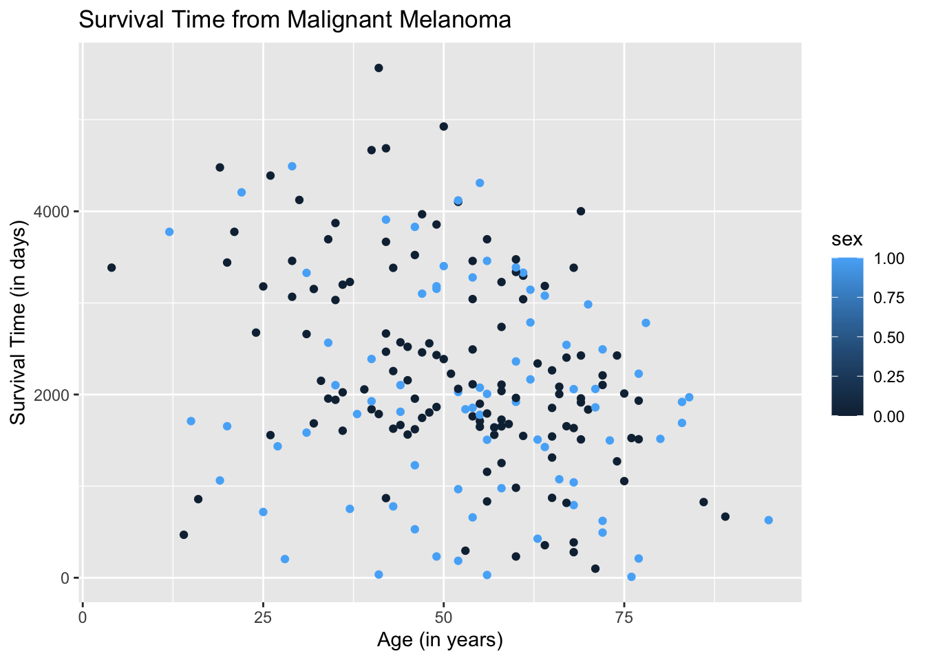 The resulting plot may be what we want. However, if we take a closer look at the legend, ggplot2 is treating the variable sex as quantitative when it is categorical. We need to instruct the aes( ) argument in geom_point( ) to treat sex as a categorical variable by using the argument, factor(sex).