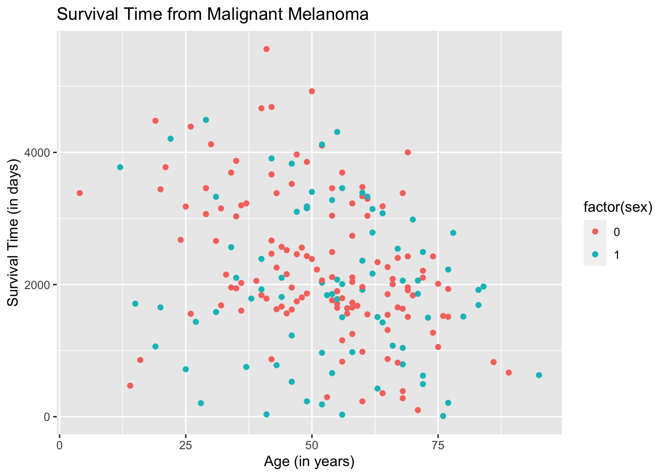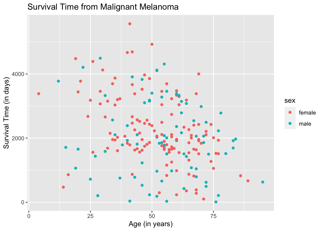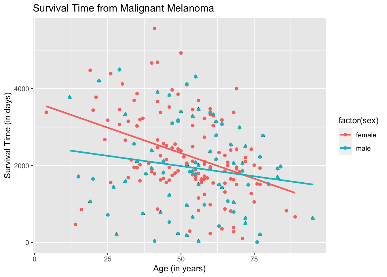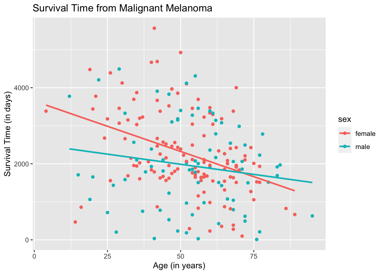 ggplot(data = Melanoma, aes(x = age, y = time, color = sex)) +