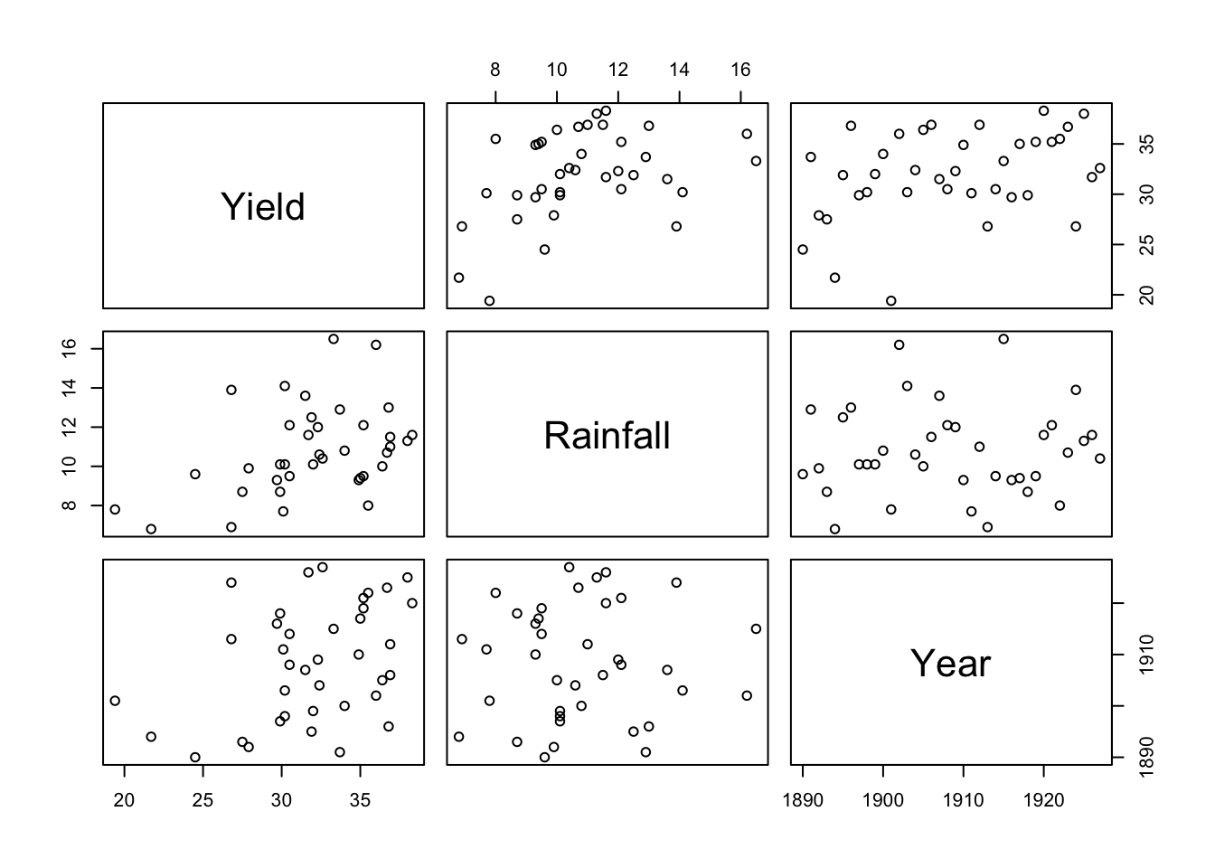 The dataset is from Ramsey and Schafer (2002). The data on corn yields and rainfall are in `ex0915’ in library(Sleuth3). Variables: