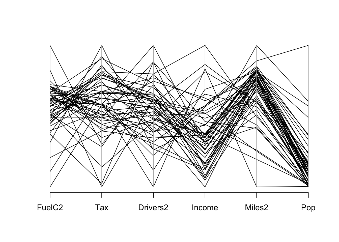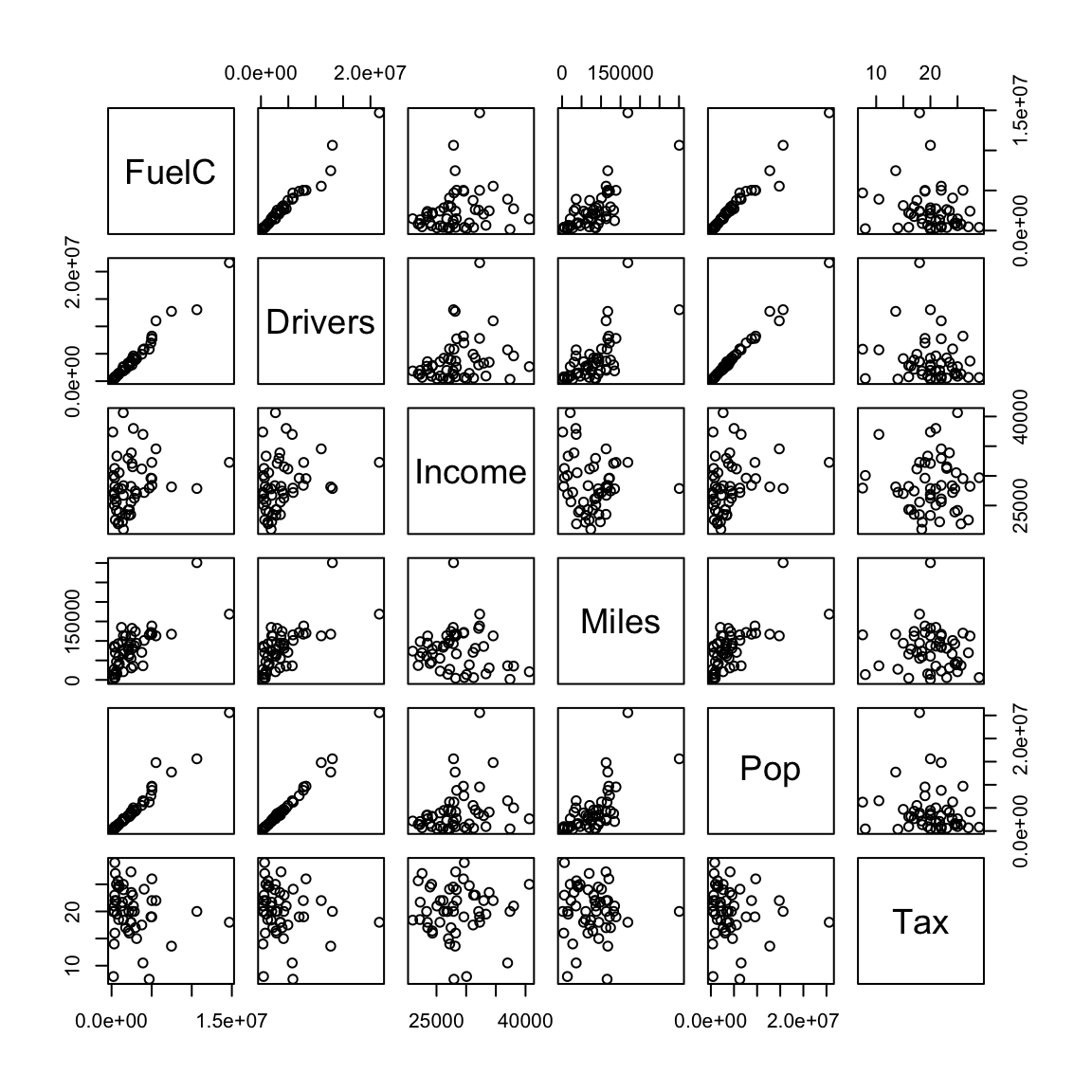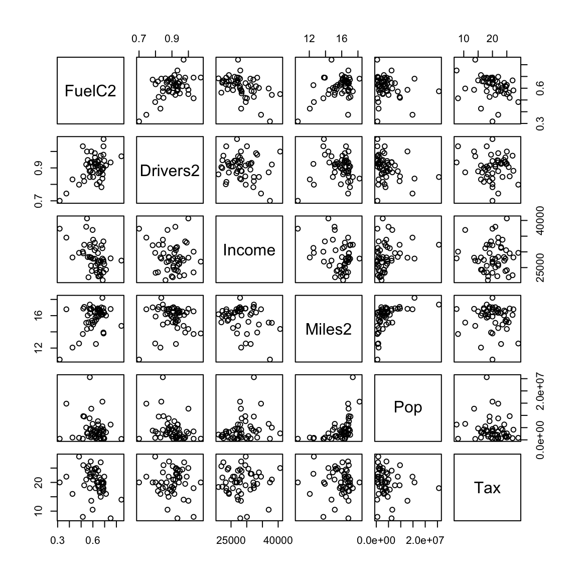 Example from: Weisberg (2005). Study how fuel consumption varies over 50 US states and the District of Columbia and the effect of state gasoline tax on the consuption.
